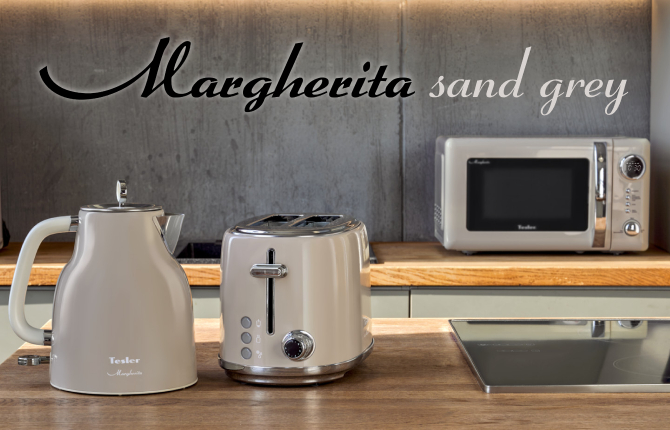 Микроволновая печь с электронным управлением, тостер с двумя слотами для хлеба и электрический чайник на 1,7 л — всё это обновлённая серия Margherita в песочно-сером оттенке! Все приборы идеально сочетаются между собой и легко впишутся в любую кухню.