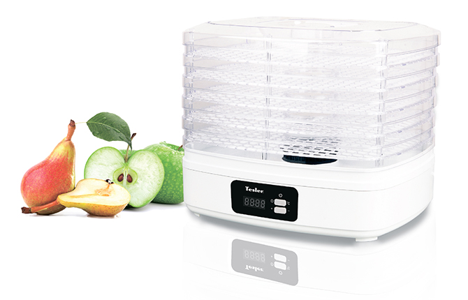 Сушилка для овощей и фруктов TESLER FD-521 снабжена пятью регулируемыми по высоте поддонами и вентилятором, который равномерно разгоняет тёплый воздух, что обеспечивает оптимальную обработку продуктов.