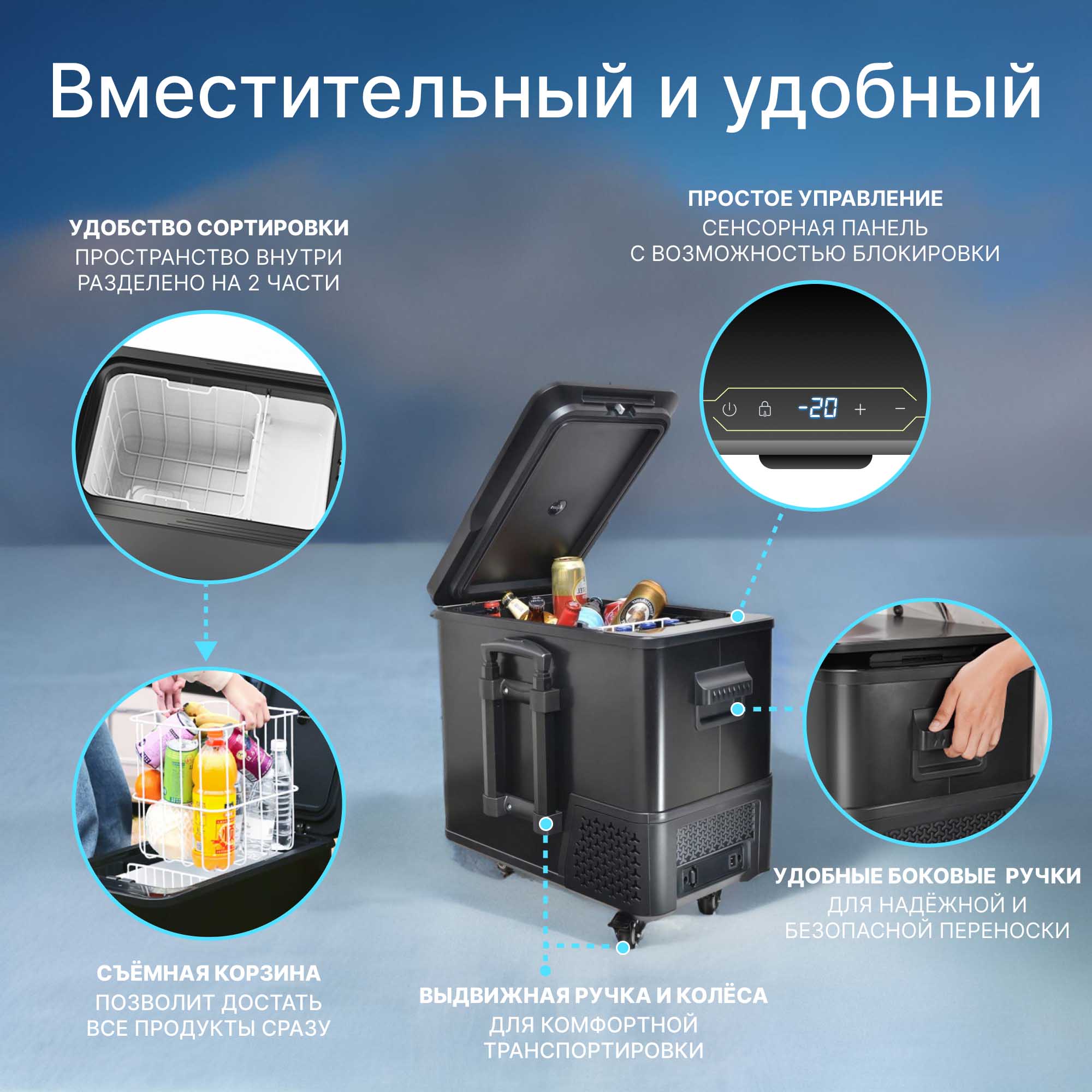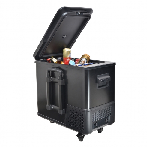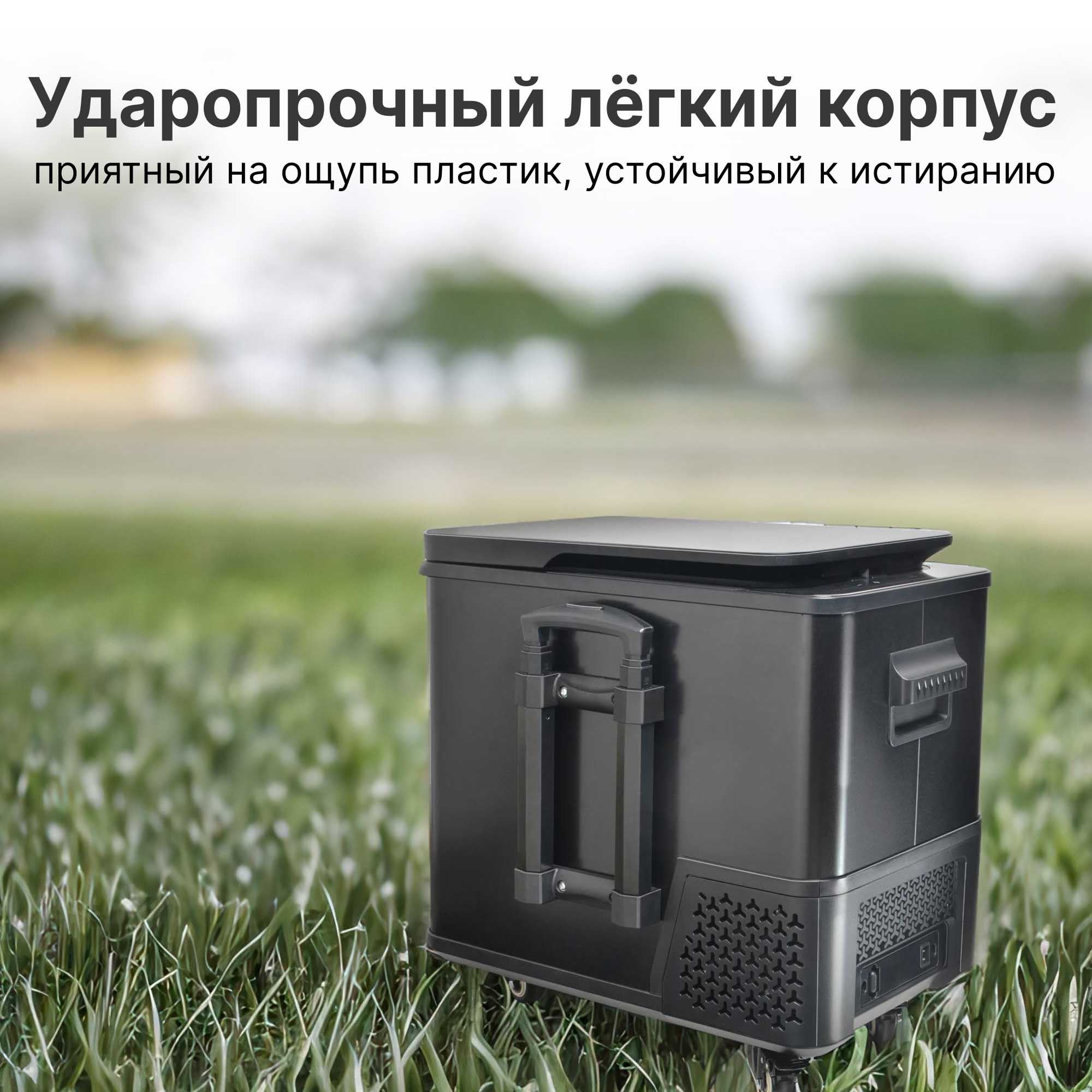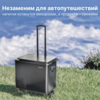 Вместительный и в то же время компактный холодильник легко размещается в салоне автомобиля. Благодаря удобной ручке и колесам холодильник комфортно транспортировать до машины.