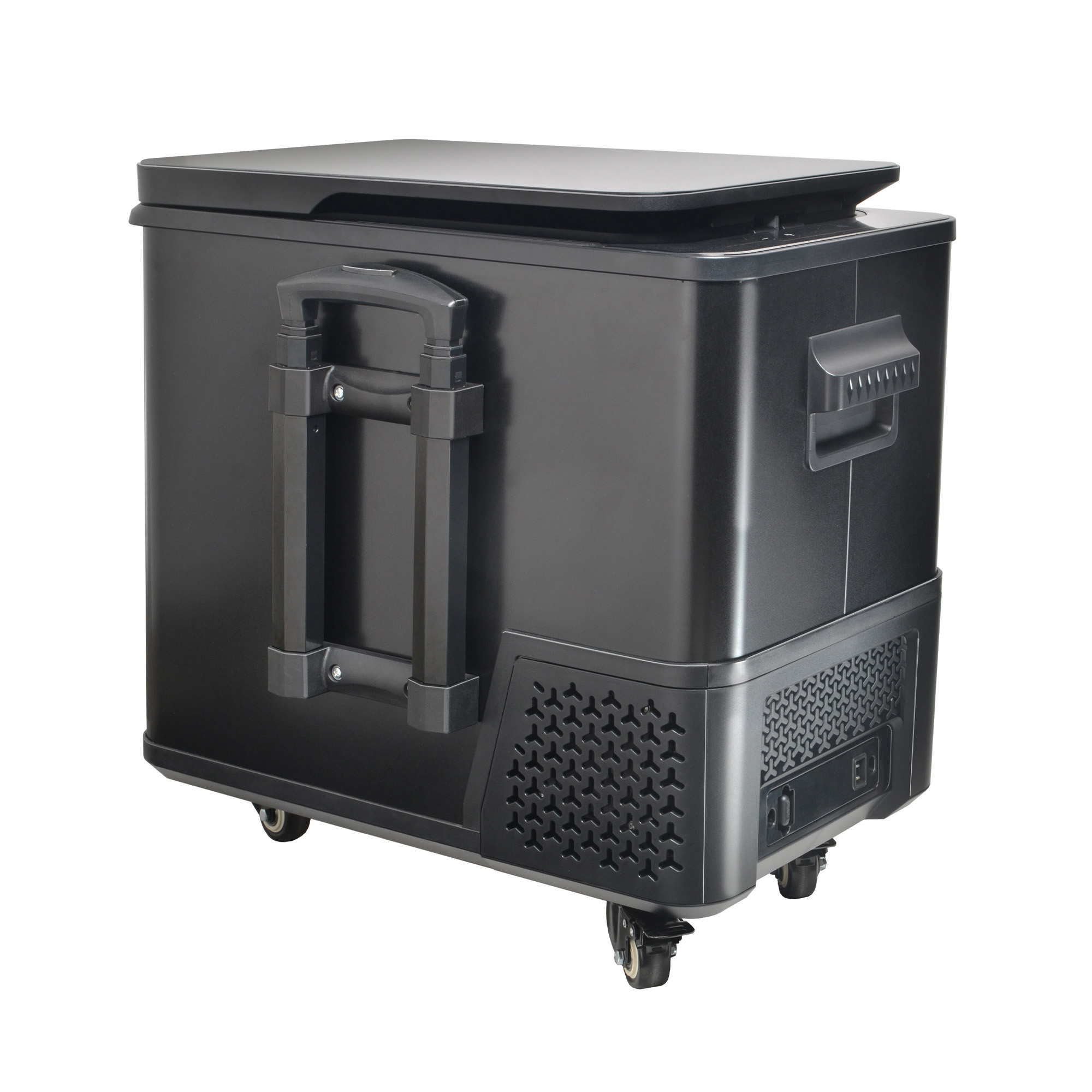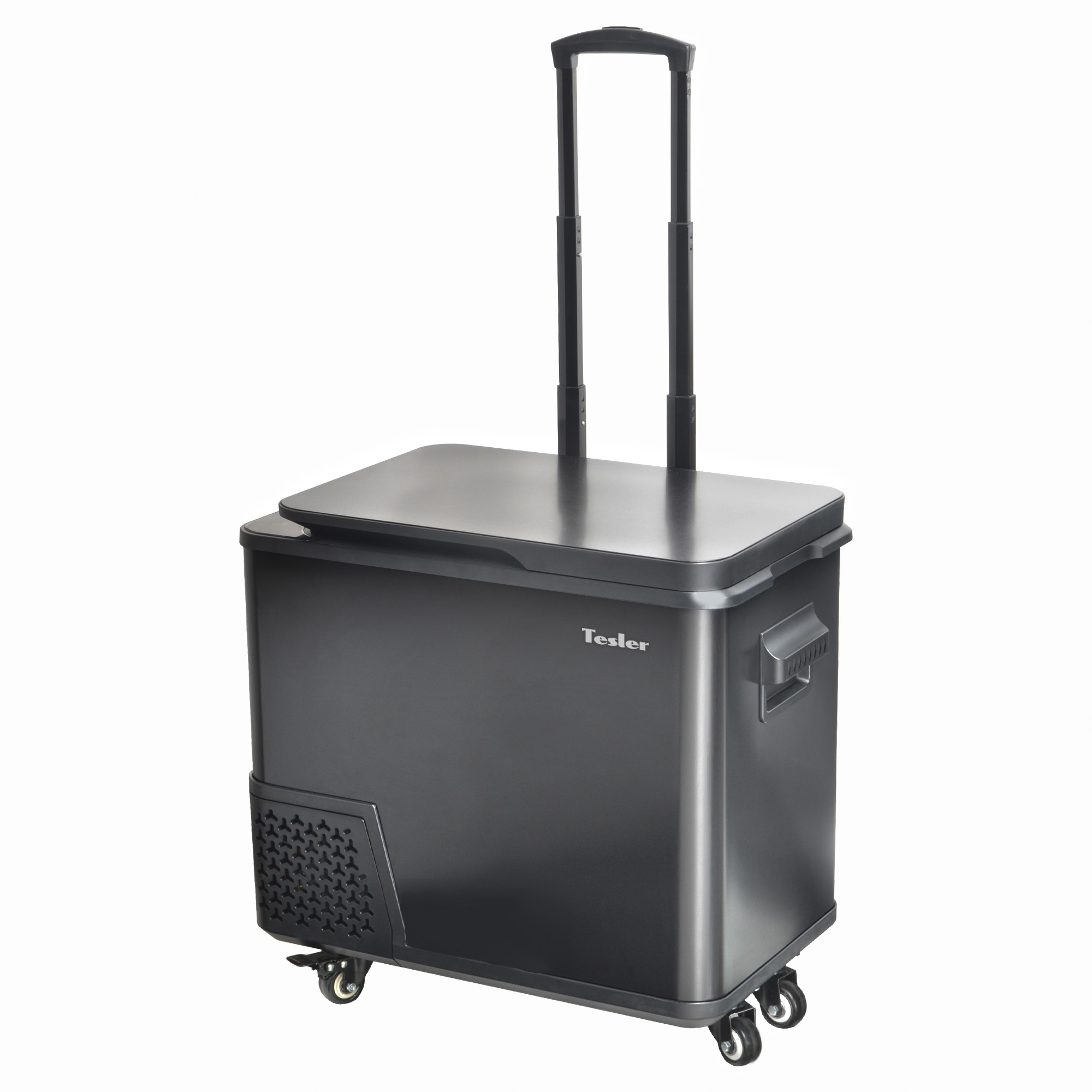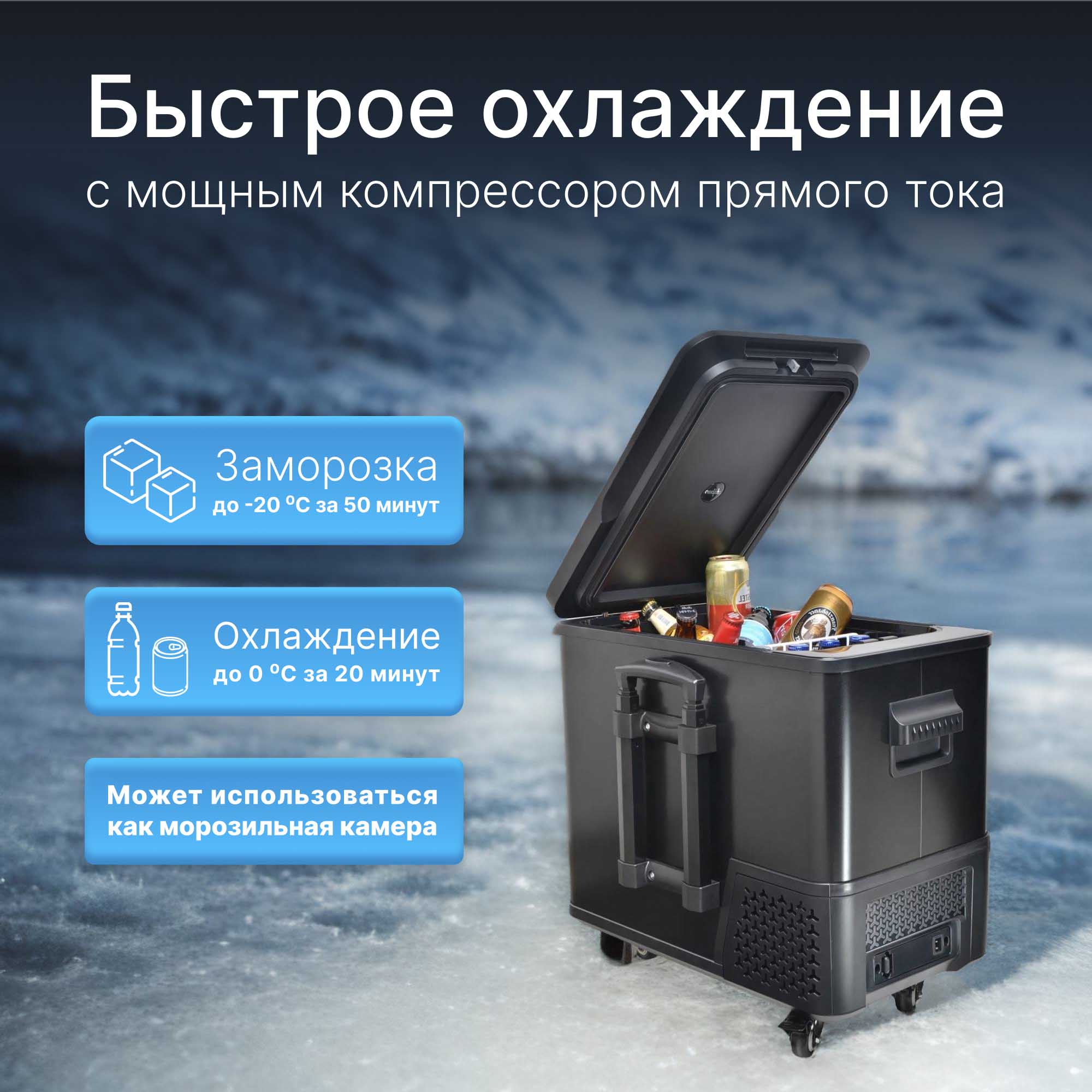 Вместительный и в то же время компактный холодильник легко размещается в салоне автомобиля. Благодаря удобной ручке и колесам холодильник комфортно транспортировать до машины.