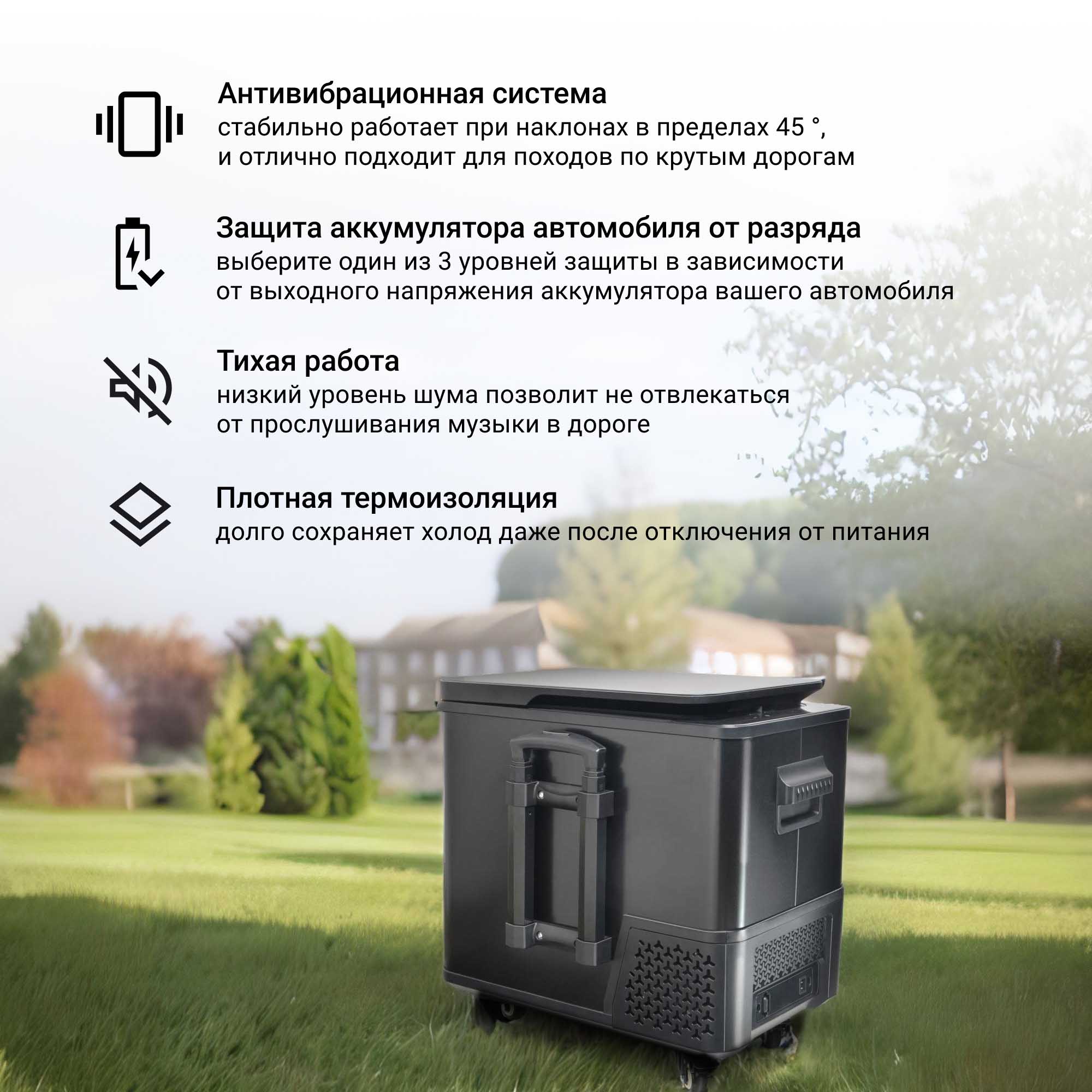 Автохолодильник TESLER CCF-4001 стабильно работает при наклонах в пределах 45 °, и отлично подходит для походов по крутым дорогам.