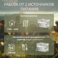 • Подключается к сетям постоянного тока и переменного тока. Может использоваться дома, в автомобиле, на яхте, в кемпинге.