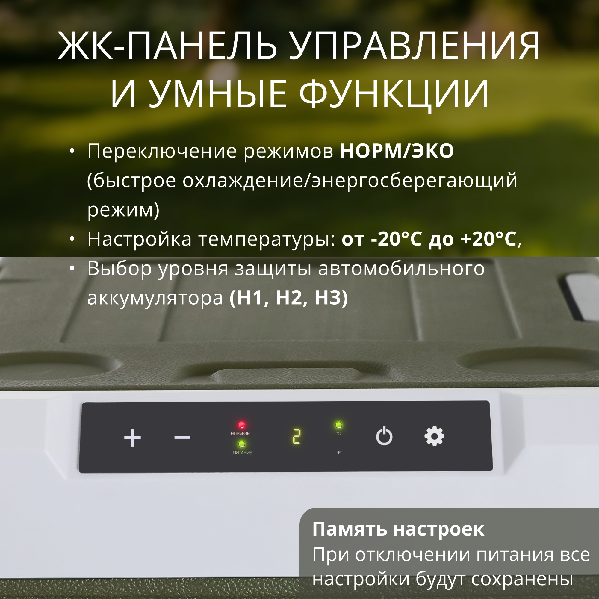 Автохолодильник  оснащен современным компрессором с низким уровнем шума и энергопотребления, а также двумя режимами: экономичным и усиленным. Интеллектуальная система автоматически защищает аккумулятор автомобиля от глубокого разряда, что особенно важно при длительных поездках. Холодильник запоминает настройки даже после отключения от питания, что удобно при временном отключении.