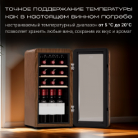 Преимуществом системы охлаждения данной модели является наличие компрессора, который использует хладагент для охлаждения внутреннего пространства, что обеспечивает стабильное поддержание температуры. Динамическая система охлаждения равномерно распределяет холод, что позволяет избежать застаивания запахов, и поддерживает постоянный уровень влажности. Температура внутри шкафа не зависит от температуры окружающей среды. Диапазон поддерживаемой температуры от 5 °C до 20°C помогает создать идеальные условия для хранения вина.