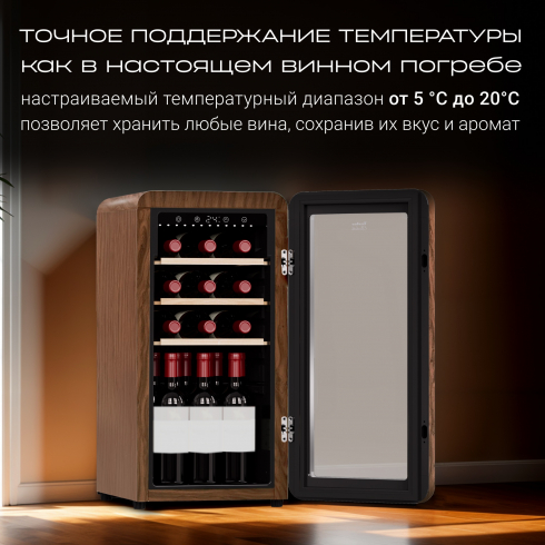 Шкаф оборудован съёмными полками из натурального дерева, которые надежно фиксируют бутылки и защищают их от вибраций. Кроме того, на дне шкафа имеется имеется возможность вертикальной выставки части коллекции.