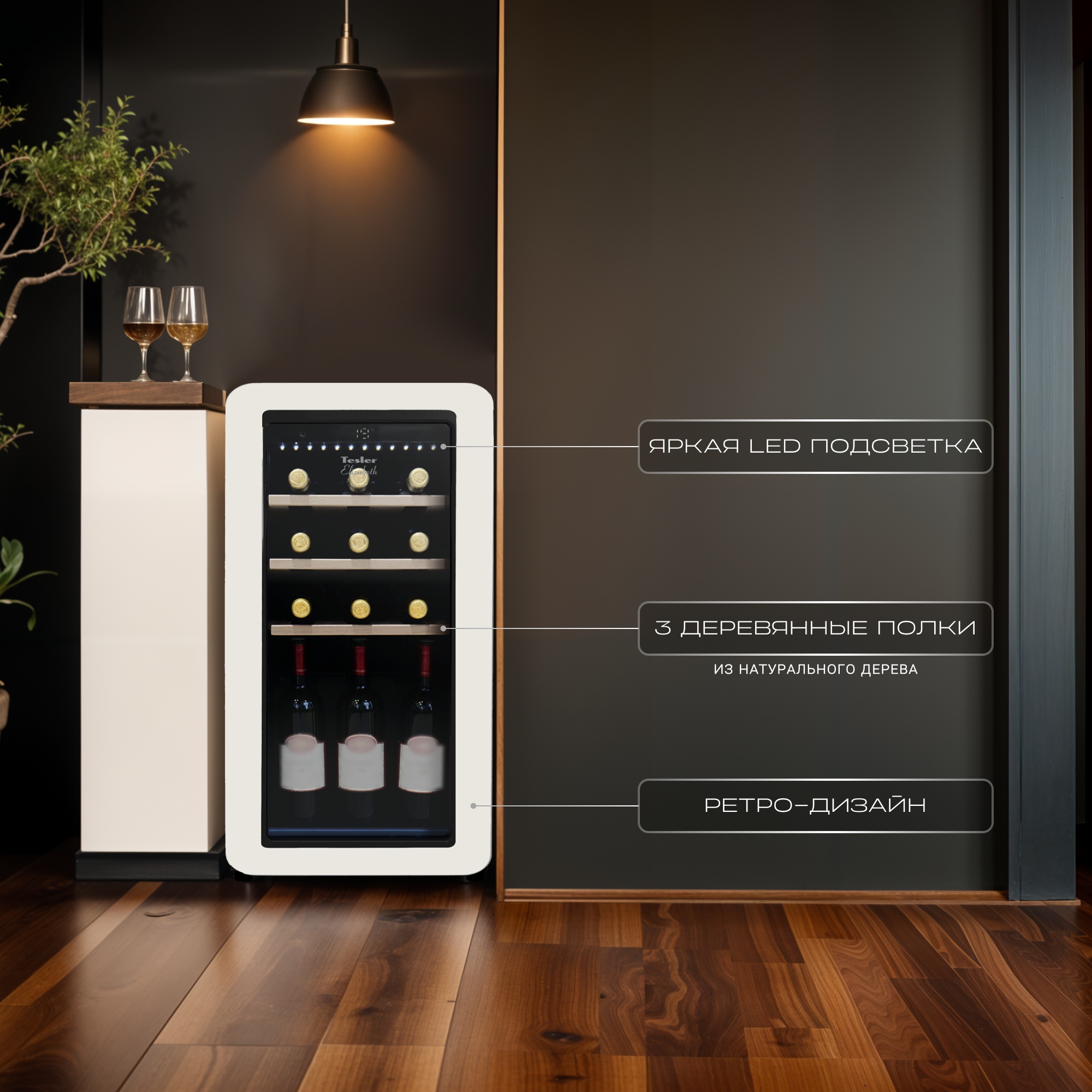 • Tesler CWC-188 — компрессорный отдельностоящий винный шкаф вместимостью 18 бутылок.