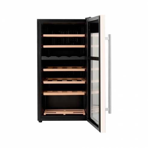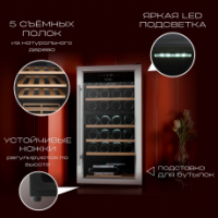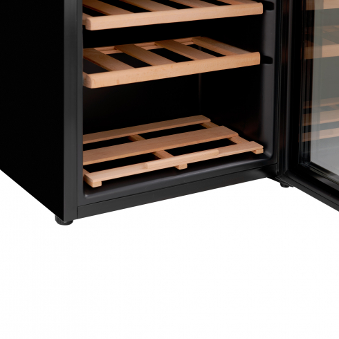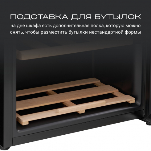 Шкаф оборудован съёмными полками из натурального дерева, которые надежно фиксируют бутылки и защищают их от вибраций. Кроме того, на дне шкафа имеется дополнительная полка-подставка.