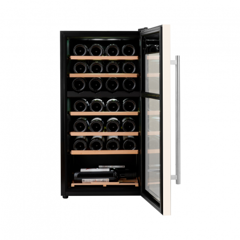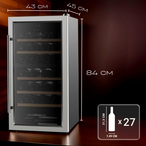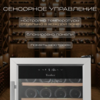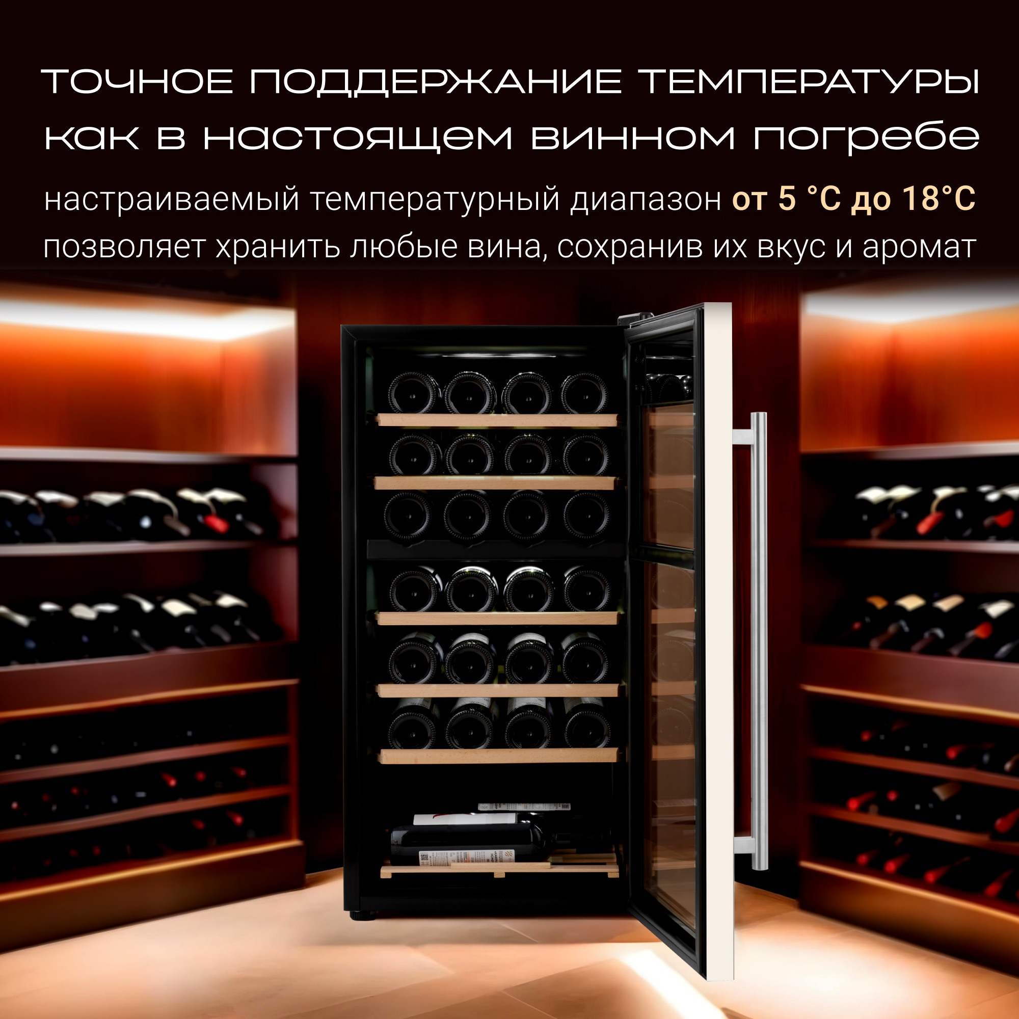 Преимуществом данной модели является наличие компрессора, который использует хладагент для охлаждения внутреннего пространства, что обеспечивает стабильное поддержание температуры. Температура внутри шкафа не зависит от температуры окружающей среды. Диапазон поддерживаемой температуры от 5 °C до 18°C помогает создать идеальные условия для хранения вина. 2 температурных зоны (12+15 бутылок) позволяют настроить разную температуру в каждом отделении, чтобы размещать внутри разные сорта вин.