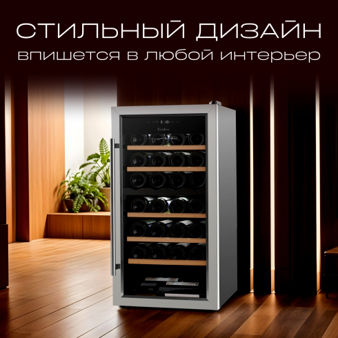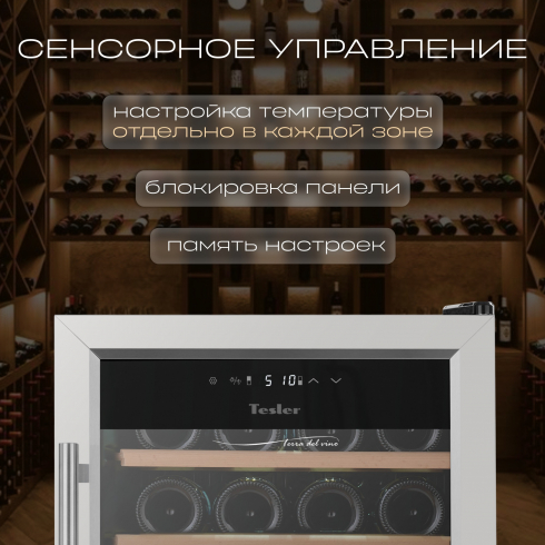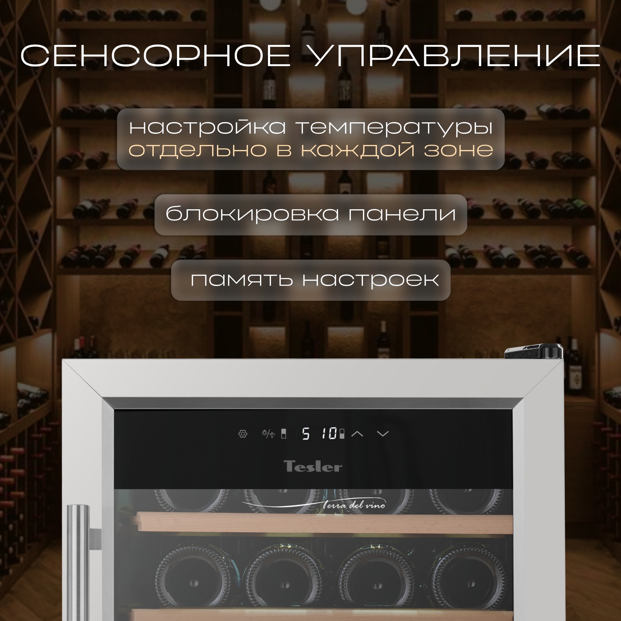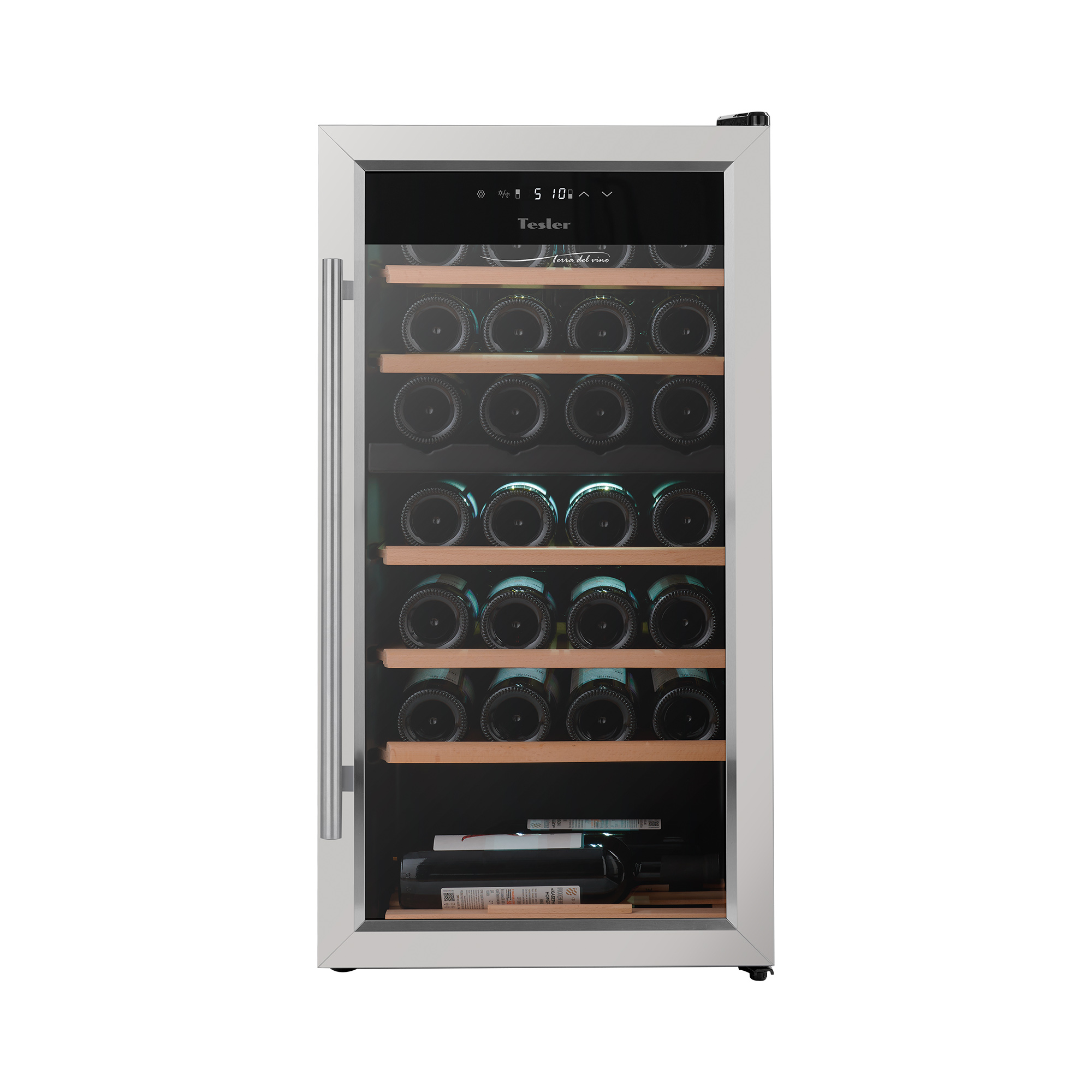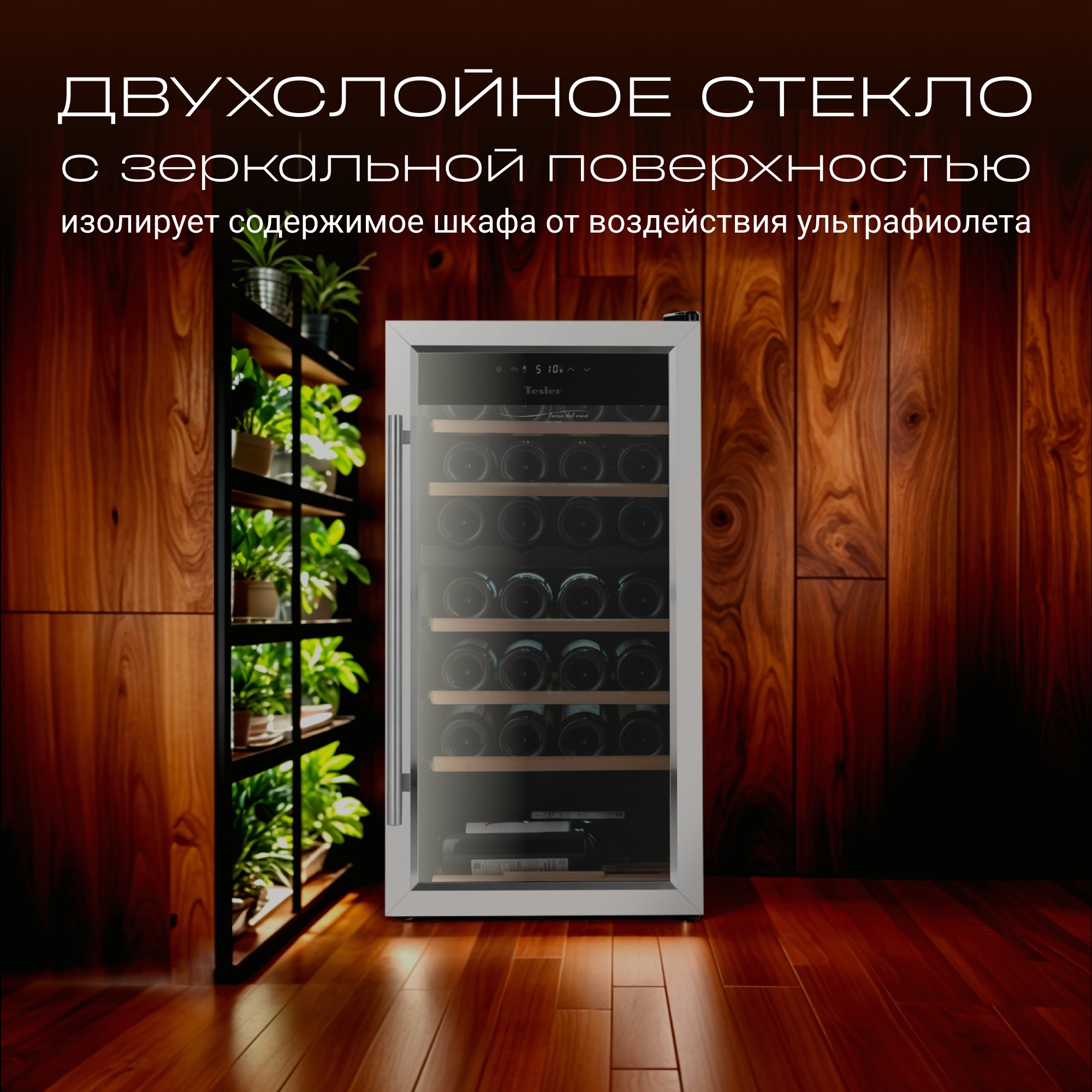 Рамка из нержавеющей стали придает устройству стильный и современный вид, а удобная ручка делает использование шкафа более комфортным. Благодаря элегантному дизайну винный шкаф Tesler легко впишется в интерьер городской квартиры, загородного дома или офиса.
