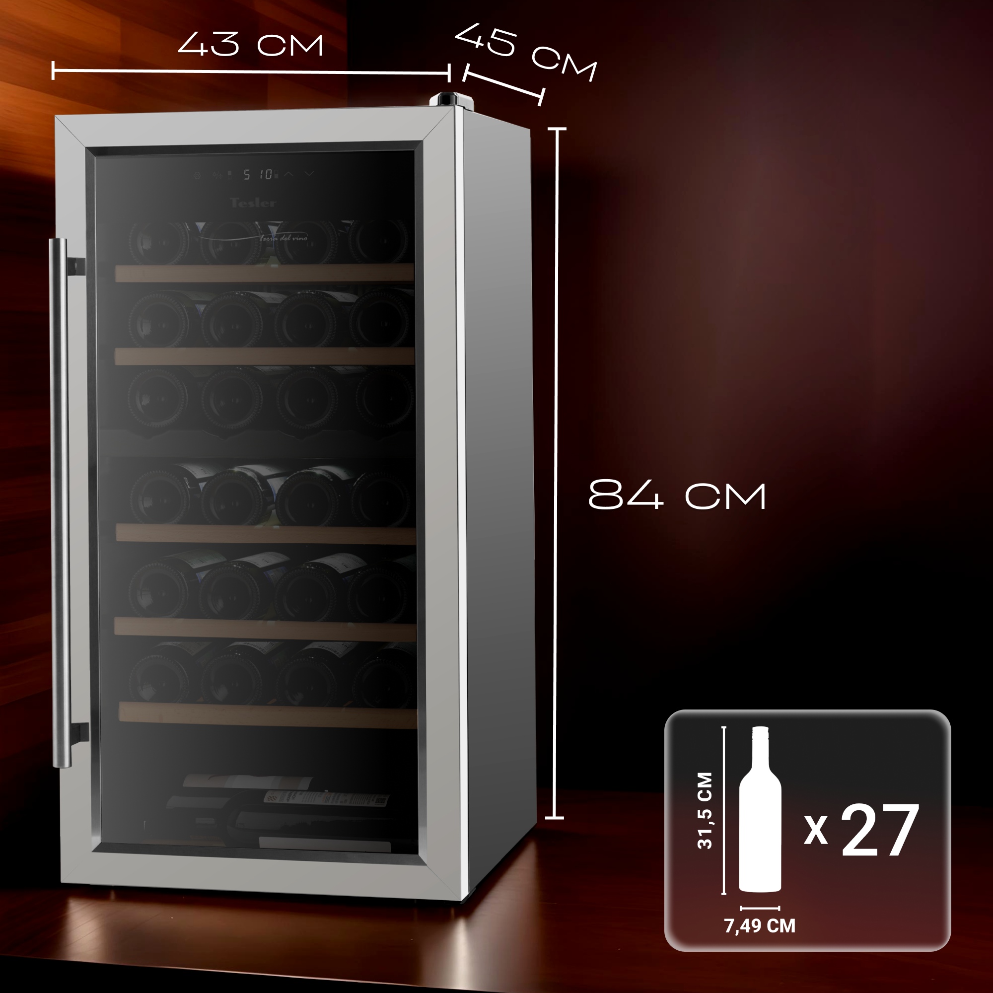 Tesler CWC-300 – компрессорный отдельностоящий винный шкаф на 2 зоны, который станет незаменимым помощником для хранения вашей коллекции вина. Вместимость шкафа составляет 27 бутылок – оптимальное количество для домашнего использования или бара.