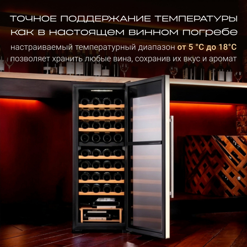• Диапазон поддерживаемой температуры – от 5°C  до 18 °C, что позволяет хранить любые сорта вин.