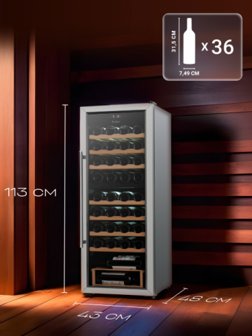 • Tesler CWC-360 — компрессорный отдельностоящий винный шкаф вместимостью 36 бутылок.
