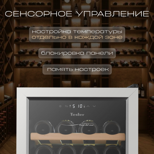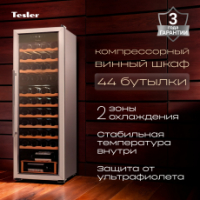Tesler CWC-400 – компрессорный отдельностоящий винный шкаф на 2 зоны, который станет незаменимым помощником для хранения вашей коллекции вина. Вместимость шкафа составляет 44 бутылки – оптимальное количество для домашнего использования или бара.