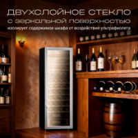 Дверца из двухслойного закалённого стекла с зеркальной поверхностью защищает напитки от воздействия света. При этом стекло позволяет увидеть этикетки, не открывая дверцу, для чего достаточно просто включить подсветку. Бесшовный уплотнитель дверцы изолирует бутылки от воздействия окружающей среды.