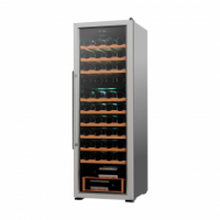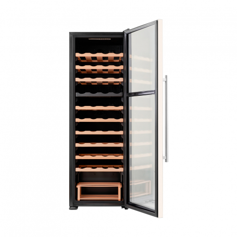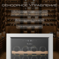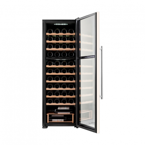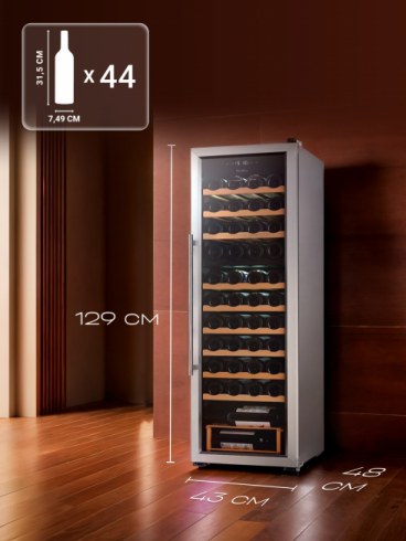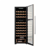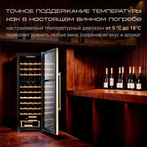 Преимуществом данной модели является наличие компрессора, который использует хладагент для охлаждения внутреннего пространства, что обеспечивает стабильное поддержание температуры. Динамическая система охлаждения равномерно распределяет холод, что позволяет избежать застаивания запахов, и поддерживает ровный уровень влажности. Температура внутри шкафа не зависит от температуры окружающей среды. Диапазон поддерживаемой температуры от 5 °C до 18°C помогает создать идеальные условия для хранения вина. 2 температурных зоны (16+28 бутылок) позволяют настроить разную температуру в каждом отделении, чтобы размещать внутри разные сорта вин.