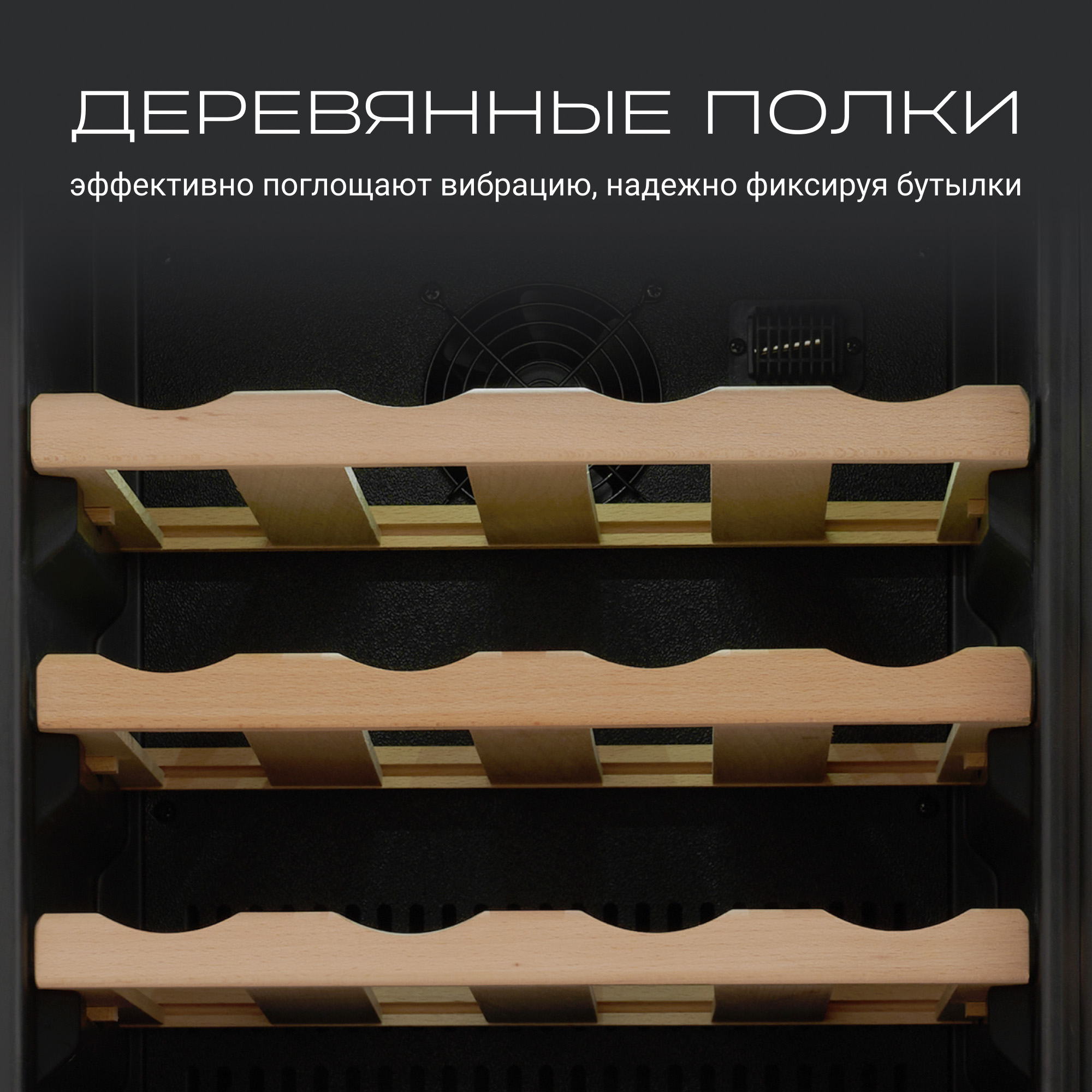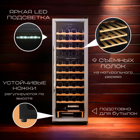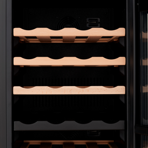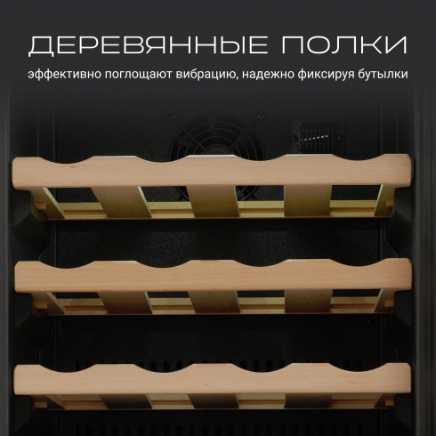 Шкаф оборудован съёмными полками из натурального дерева, которые надежно фиксируют бутылки и защищают их от вибраций. Кроме того, на дне шкафа имеется дополнительная полка-подставка для 4 бутылок.