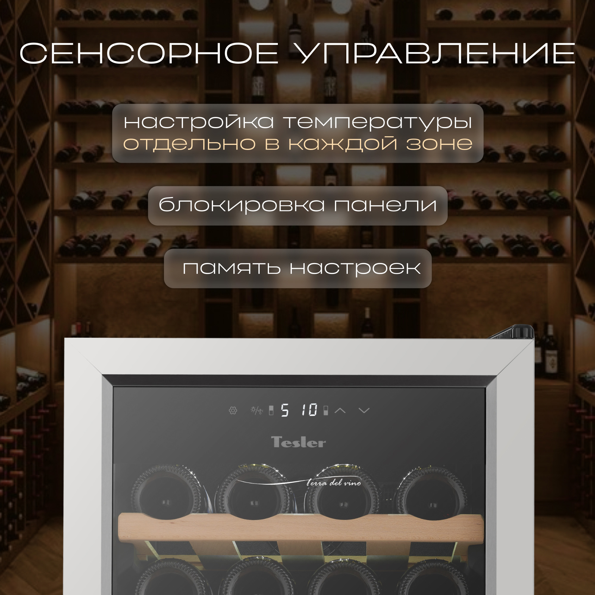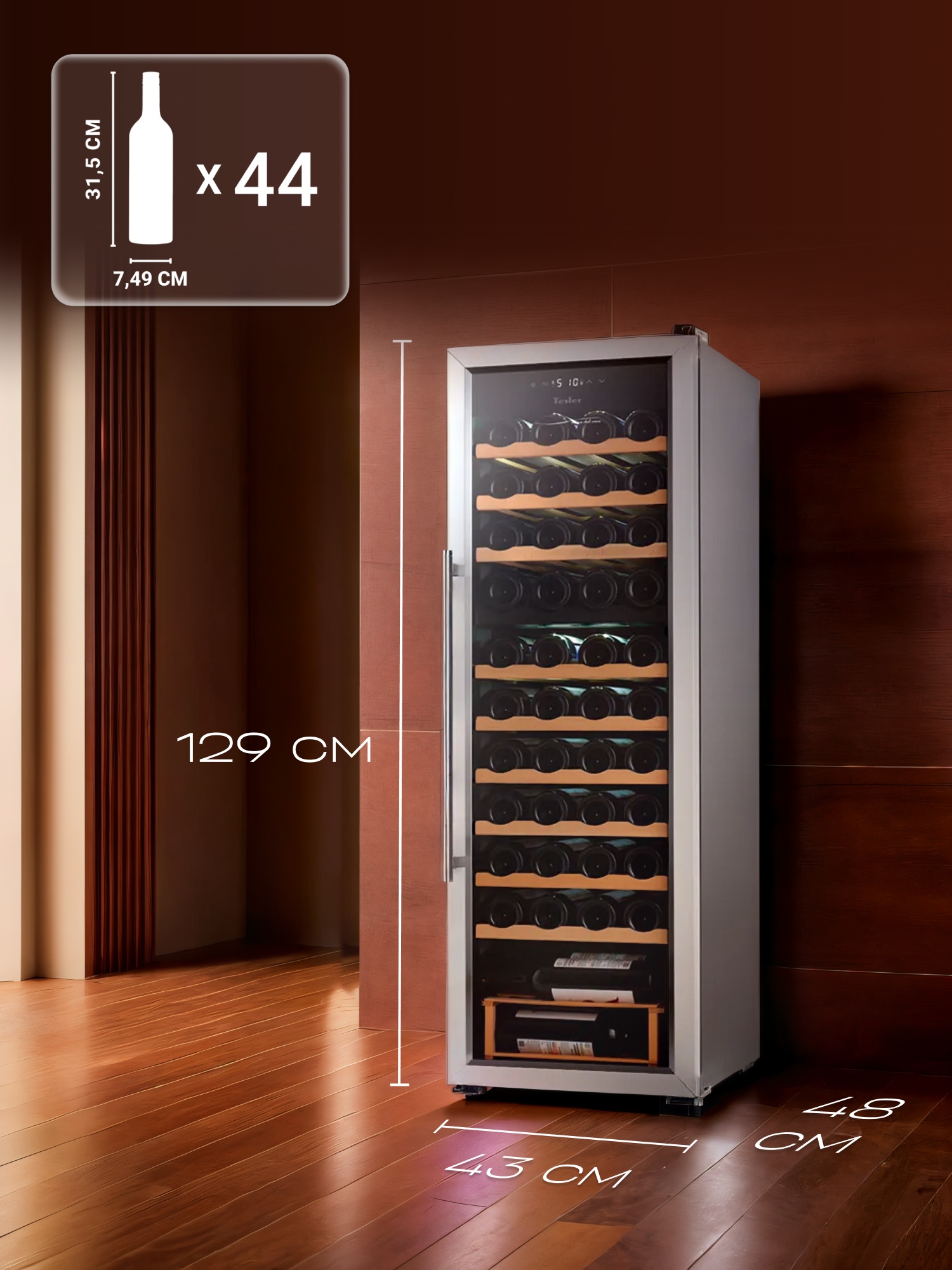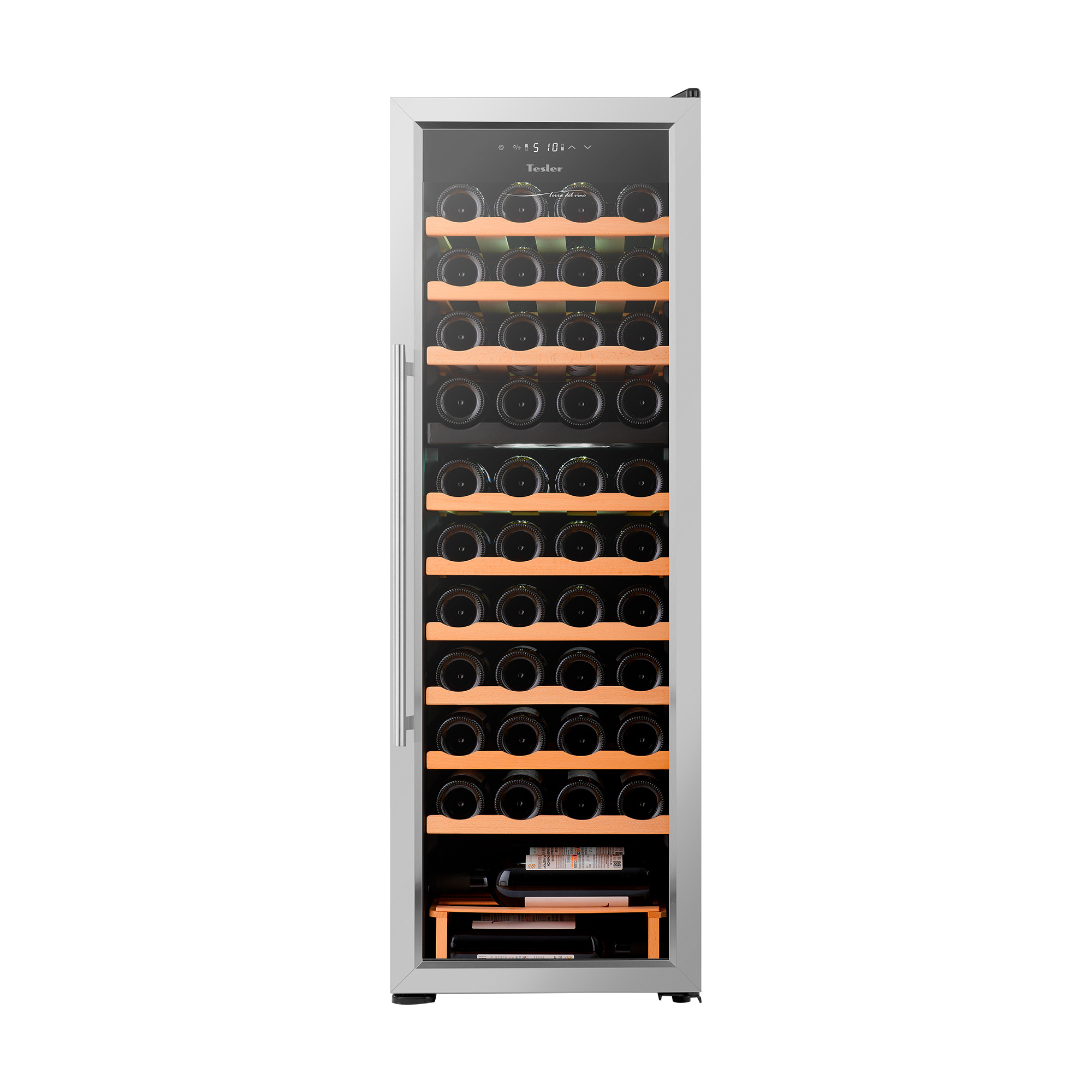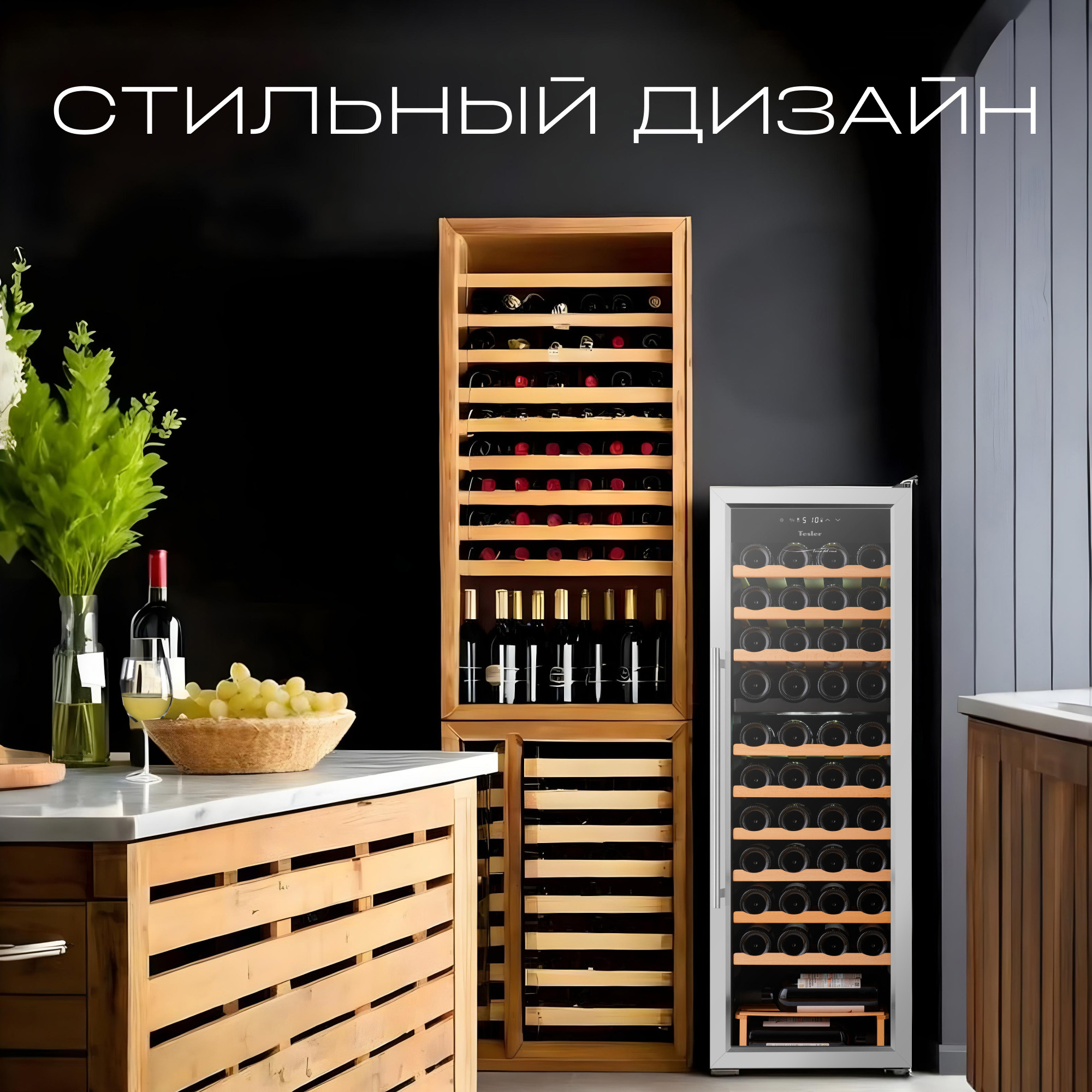 Рамка из нержавеющей стали придает устройству стильный и современный вид, а удобная ручка делает использование шкафа комфортным. Благодаря элегантному дизайну винный шкаф Tesler легко впишется в интерьер городской квартиры, загородного дома или офиса.