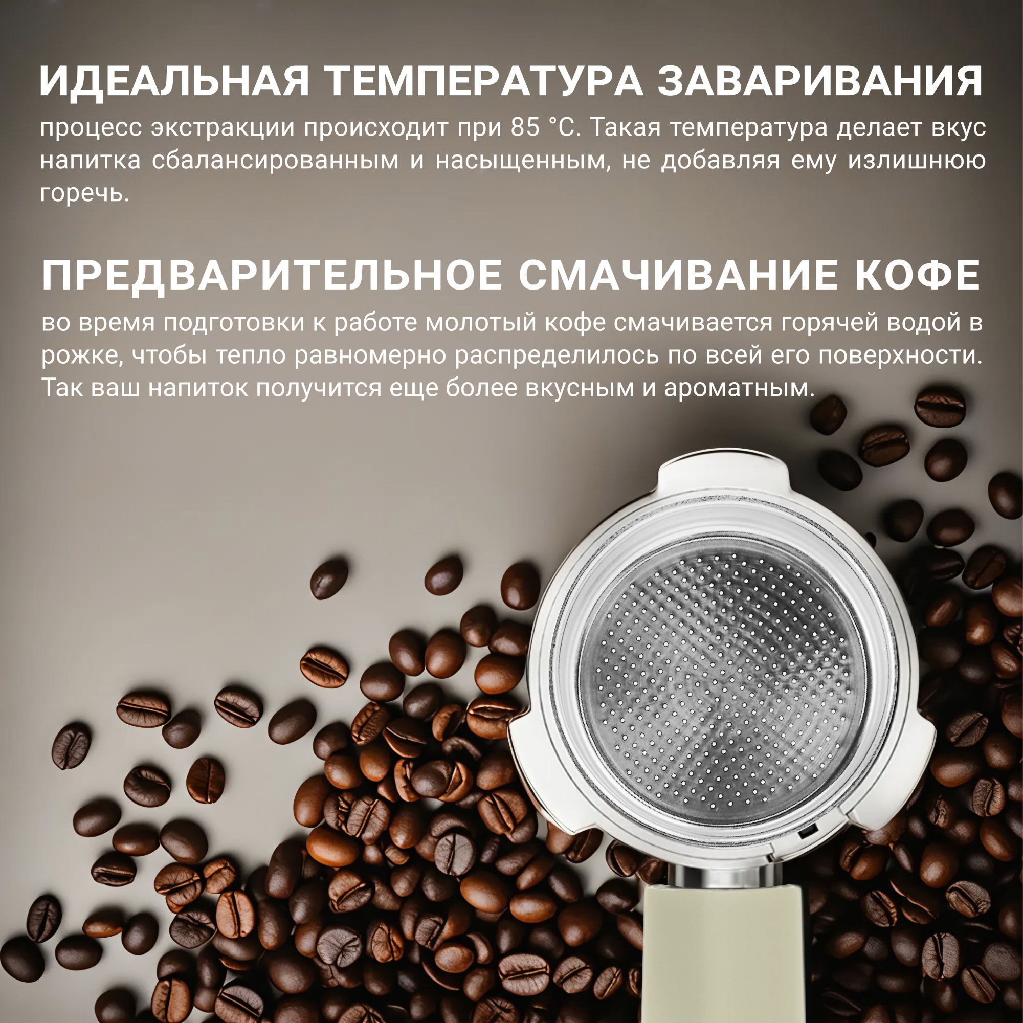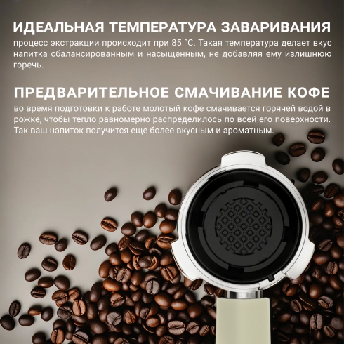 Во время подготовки к работе в рожке происходит предварительное смачивание молотого кофе горячей водой, чтобы тепло равномерно распределилось по всей поверхности кофе. Так ваш напиток получится еще более вкусным и ароматным. Сам процесс экстракции происходит при температуре 85 °C. Такая температура заваривания делает вкус напитка сбалансированным и насыщенным, не добавляя ему излишнюю горечь.