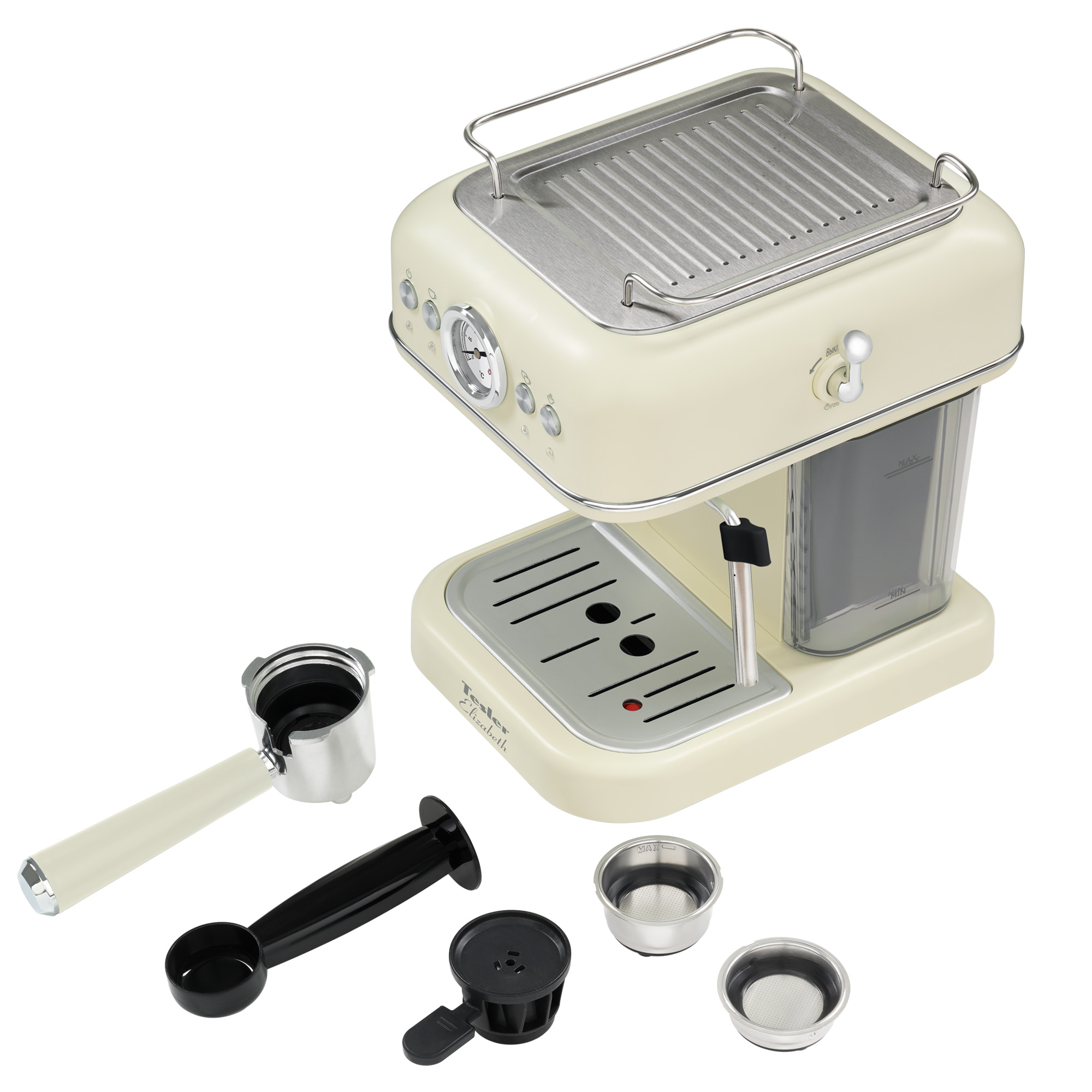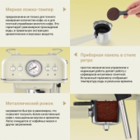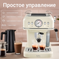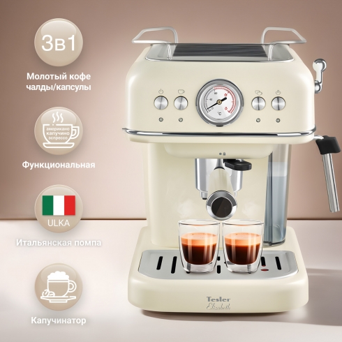 Рожковая кофеварка Tesler ECM-245 - часть серии Elizabeth. Техника Elizabeth не останется незамеченной на вашей кухне: каждый прибор выполнен в винтажном стиле, и сочетает в себе высокие технологии с интуитивно понятным управлением. Комплект также включает в себя тостер TT-245 на 2 слота, тостер ТТ-445 на 4 слота, чайник объёмом 1,7 л и микроволновую печь.