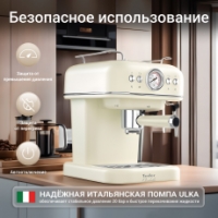 Мощность кофеварки составляет 950 Вт, а давление достигает 20 бар, что гарантирует насыщенный вкус каждой приготовленной чашки. Итальянская помпа ULKA обеспечивает более стабильное и точное давление воды, что важно для правильного экстрагирования кофе и получения качественного напитка.