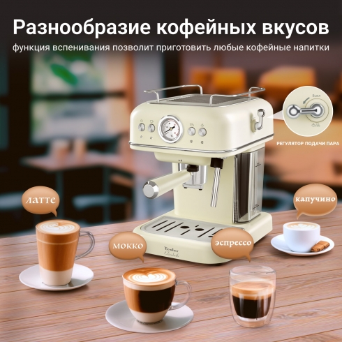 Кофеварка Tesler ECM-245 подарит вам возможность наслаждаться каждой каплей вашего любимого напитка, и будет радовать вас и ваших близких каждый день. Модель выпускается в бежевом, песочно-сером и зелёном цветах.
