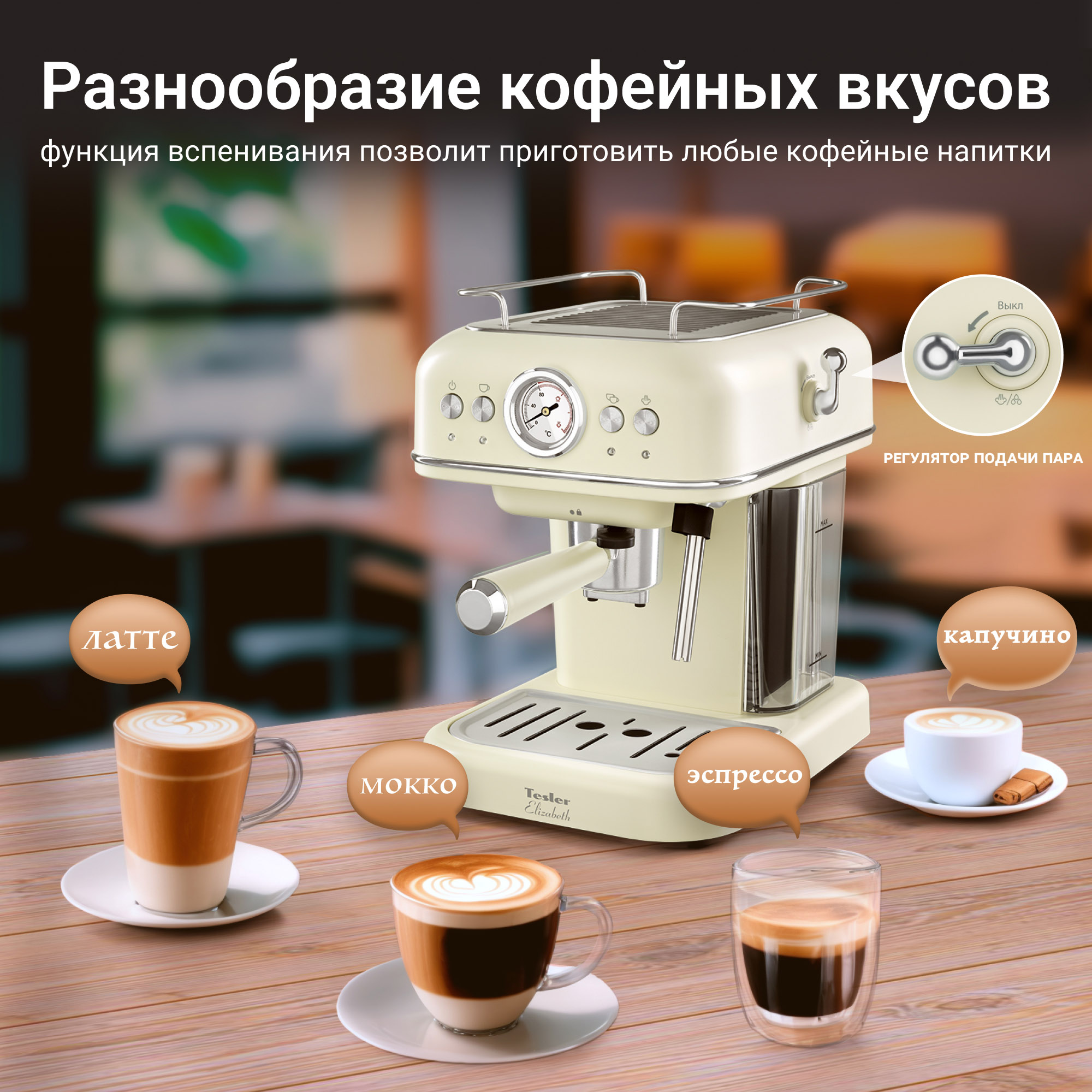 Рожковая кофеварка Tesler ECM-245 станет прекрасным выбором для ценителей кофе, и позволяет приготовить ароматный эспрессо, насыщенный капучино или бархатистый латте. Вечный ретро-стиль, современные технологии и внимание к деталям объединяются, чтобы создать настоящее произведение искусства в мире кофе. Панель управления с отображением температуры воды в реальном времени позволяет контролировать процесс приготовления.