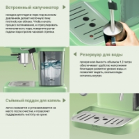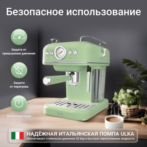 Мощность кофеварки составляет 950 Вт, а давление достигает 20 бар, что гарантирует насыщенный вкус каждой приготовленной чашки. Итальянская помпа ULKA обеспечивает более стабильное и точное давление воды, что важно для правильного экстрагирования кофе и получения качественного напитка.
