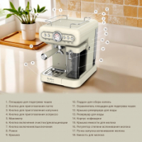 Мощность кофеварки составляет 950 Вт, а давление достигает 19 бар, что гарантирует насыщенный вкус каждой приготовленной чашки. Итальянская помпа ULKA обеспечивает стабильное и точное давление воды, что важно для правильного экстрагирования кофе и получения качественного напитка.