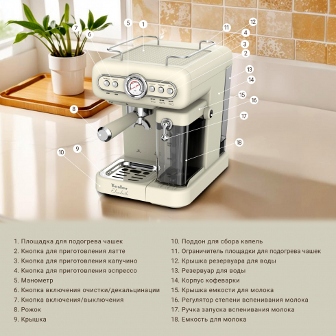 Преимуществом Tesler ECM-250 является наличие отдельного контейнера для молока. Благодаря ему процесс приготовления напитков с молочной пенкой, таких как капучино или латте, становится максимально быстрым и удобным. Контейнер легко снимается и моется, что значительно упрощает уход за кофеваркой. Вы можете хранить в нём молоко после использования, поставив контейнер в холодильник.