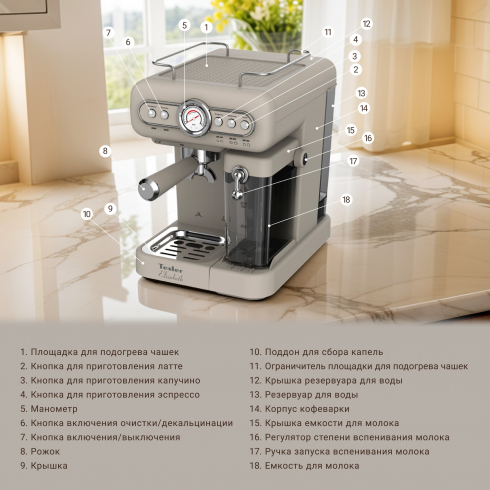 Преимуществом Tesler ECM-250 является наличие отдельного контейнера для молока. Благодаря ему процесс приготовления напитков с молочной пенкой, таких как капучино или латте, становится максимально быстрым и удобным. Контейнер легко снимается и моется, что значительно упрощает уход за кофеваркой. Вы можете хранить в нём молоко после использования, поставив контейнер в холодильник.