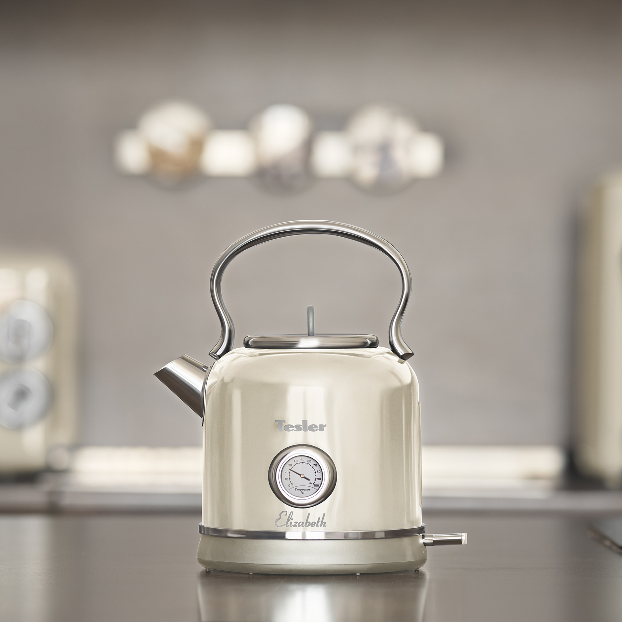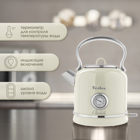Оптимальные характеристики объёма и мощности, высокое качество сборки и материалов, а также привлекательный внешний вид выгодно выделяют электрический чайник Tesler Elizabeth KT-1745 среди прочих. На корпусе расположился небольшой термометр, который поможет вам точно контролировать температуру воды, а контактная группа Otter (Великобритания) гарантирует надежную работу и защиту от перегрева при "сухом старте". Благодаря трёхуровневой системе защиты контроллер просто не позволит чайнику перегреться.