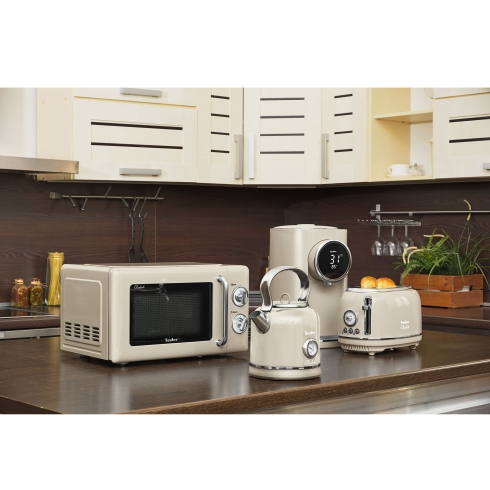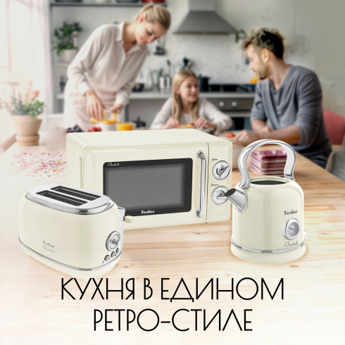 В коллекцию кухонной техники Tesler Elizabeth входят: СВЧ-печь, чайник, кофемашина и тостер.
