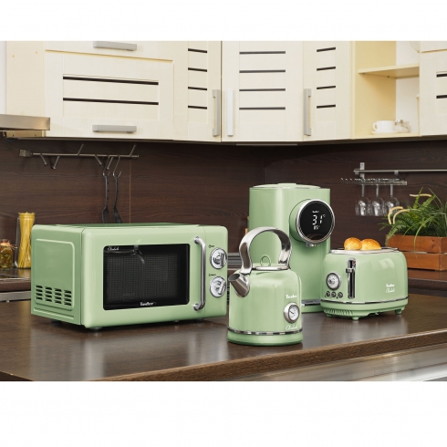 В комплект кухонной техники Tesler Elizabeth входят 3 устройства: СВЧ-печь, чайник и тостер.