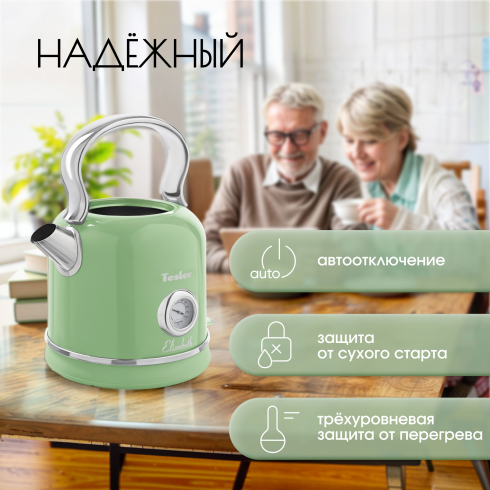 Оптимальные характеристики объёма и мощности, высокое качество сборки и материалов, а также привлекательный внешний вид выгодно выделяют электрический чайник Tesler Elizabeth KT-1745 среди прочих. На корпусе расположился небольшой термометр, который поможет вам точно контролировать температуру воды, а контактная группа Otter (Великобритания) гарантирует надежную работу и защиту от перегрева при "сухом старте". Благодаря трёхуровневой системе защиты контроллер просто не позволит чайнику перегреться.