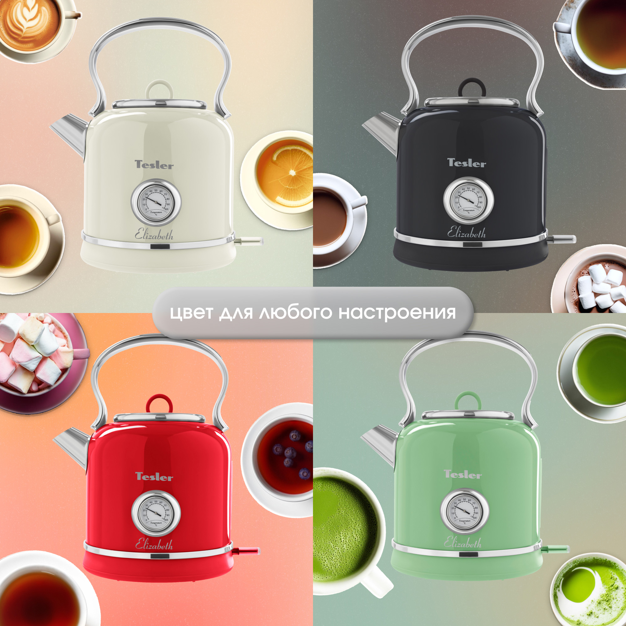 Модель Tesler Elizabeth KT-1745 доступна в следующих цветах корпуса: красный, бежевый, зеленый, серый, тёмно-синий и песочно-серый.