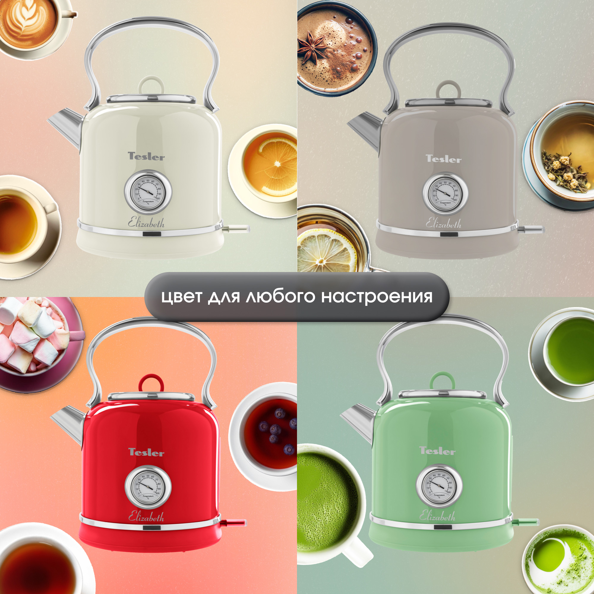 Модель Tesler Elizabeth KT-1745 доступна в следующих цветах корпуса: красный, бежевый, зеленый, серый, тёмно-синий и песочно-серый.