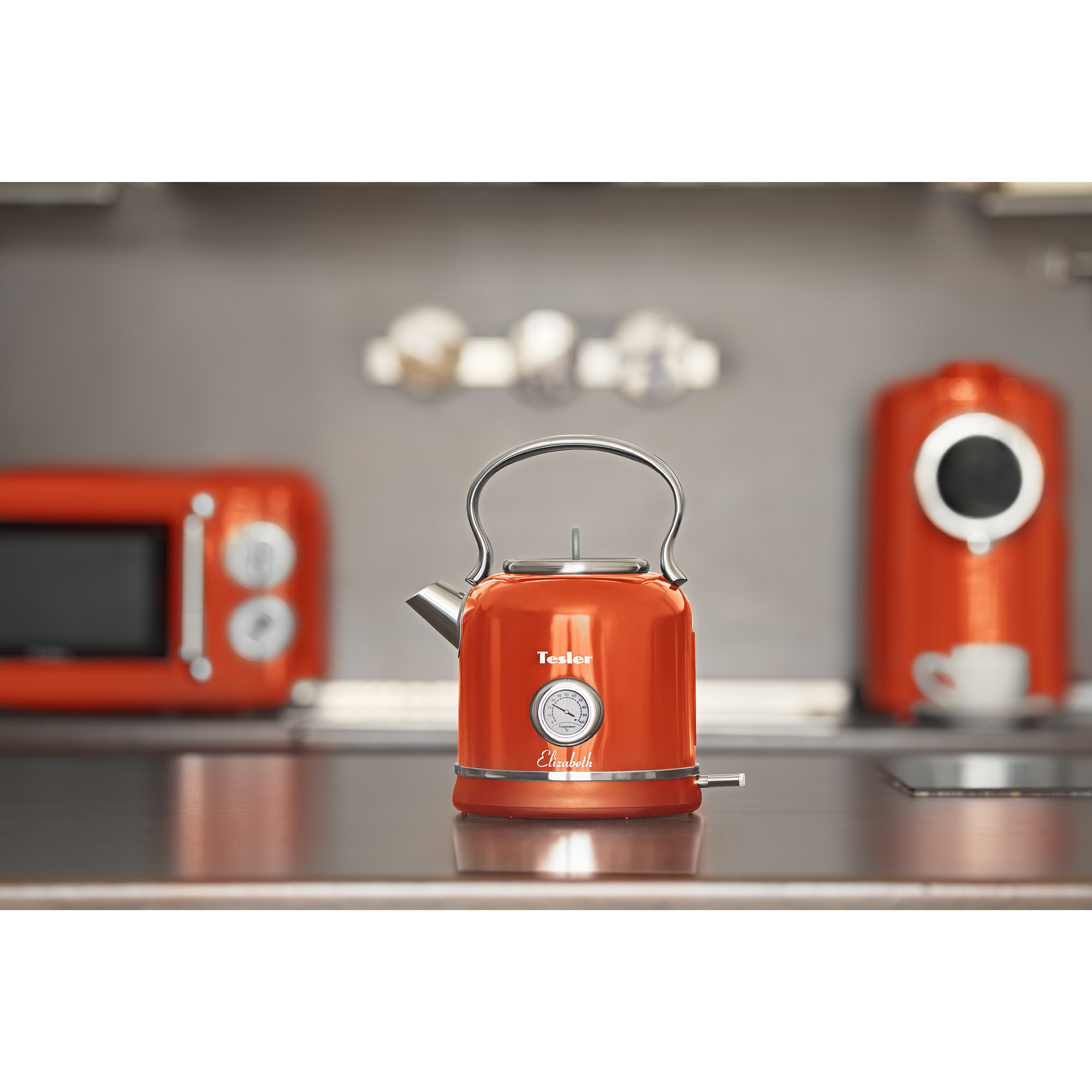 • В комплект кухонной техники Tesler Elizabeth входят 3 устройства: СВЧ-печь, чайник и тостер.