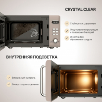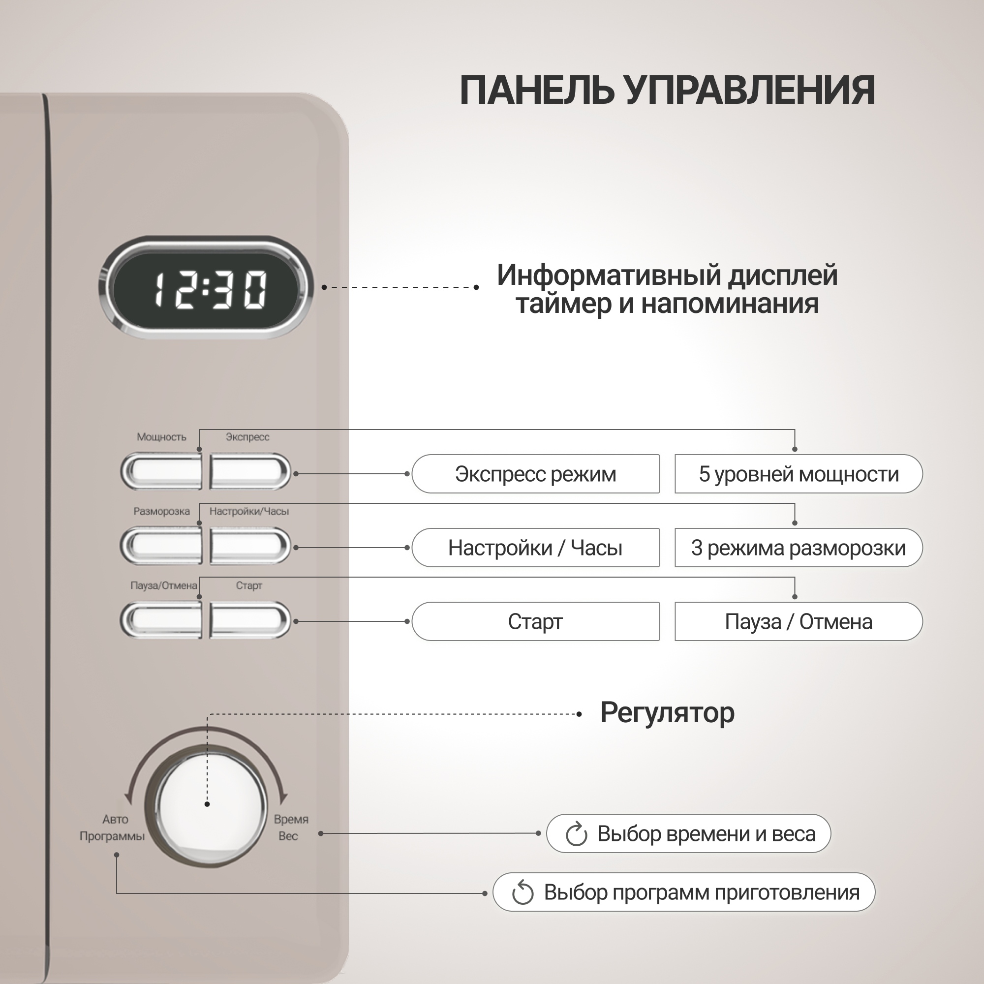 • Широкий функционал: режим разморозки, экспресс-режим, быстрый старт, отложенный старт, 8 автопрограмм, 5 уровней мощностей, защита от детей, таймер.