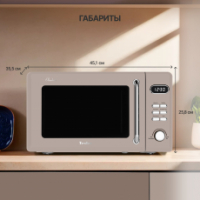 Энергопитание от стандартной сети 220 В. Конструкция оснащена ротационным механизмом с рабочей поверхностью 24,5 см, обеспечивающим симметричный прогрев пищевых продуктов за счет циклического перемещения в камере.