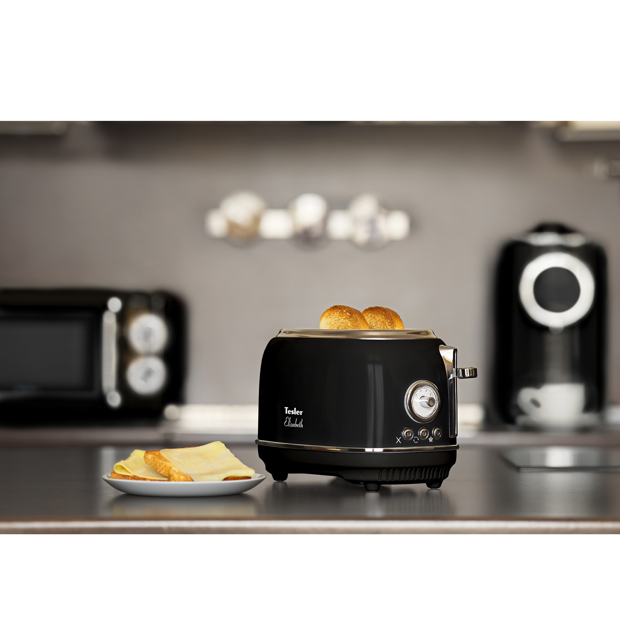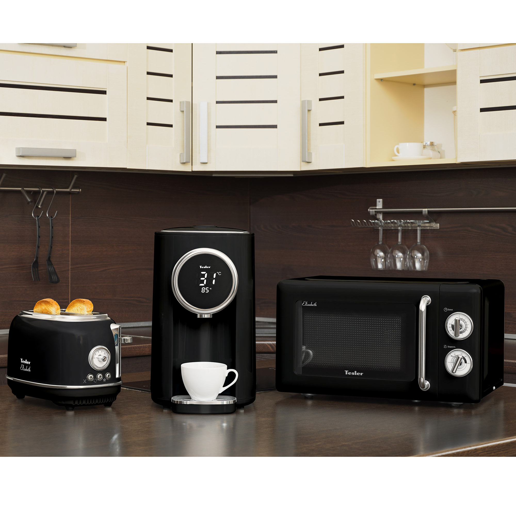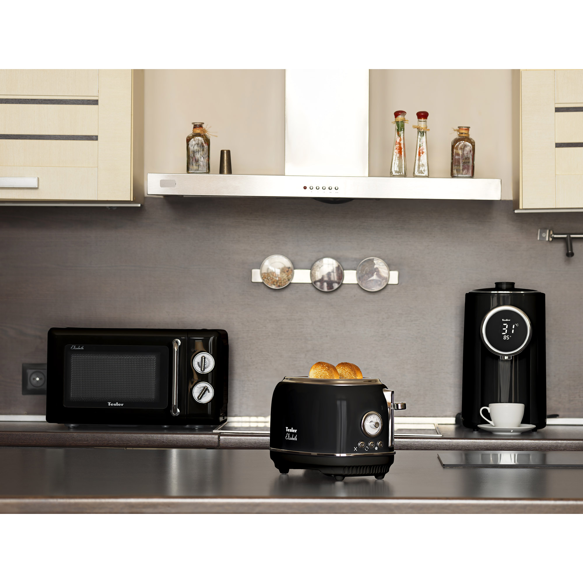 В комплект кухонной техники Tesler Elizabeth входят 3 устройства: СВЧ-печь, чайник и тостер.
