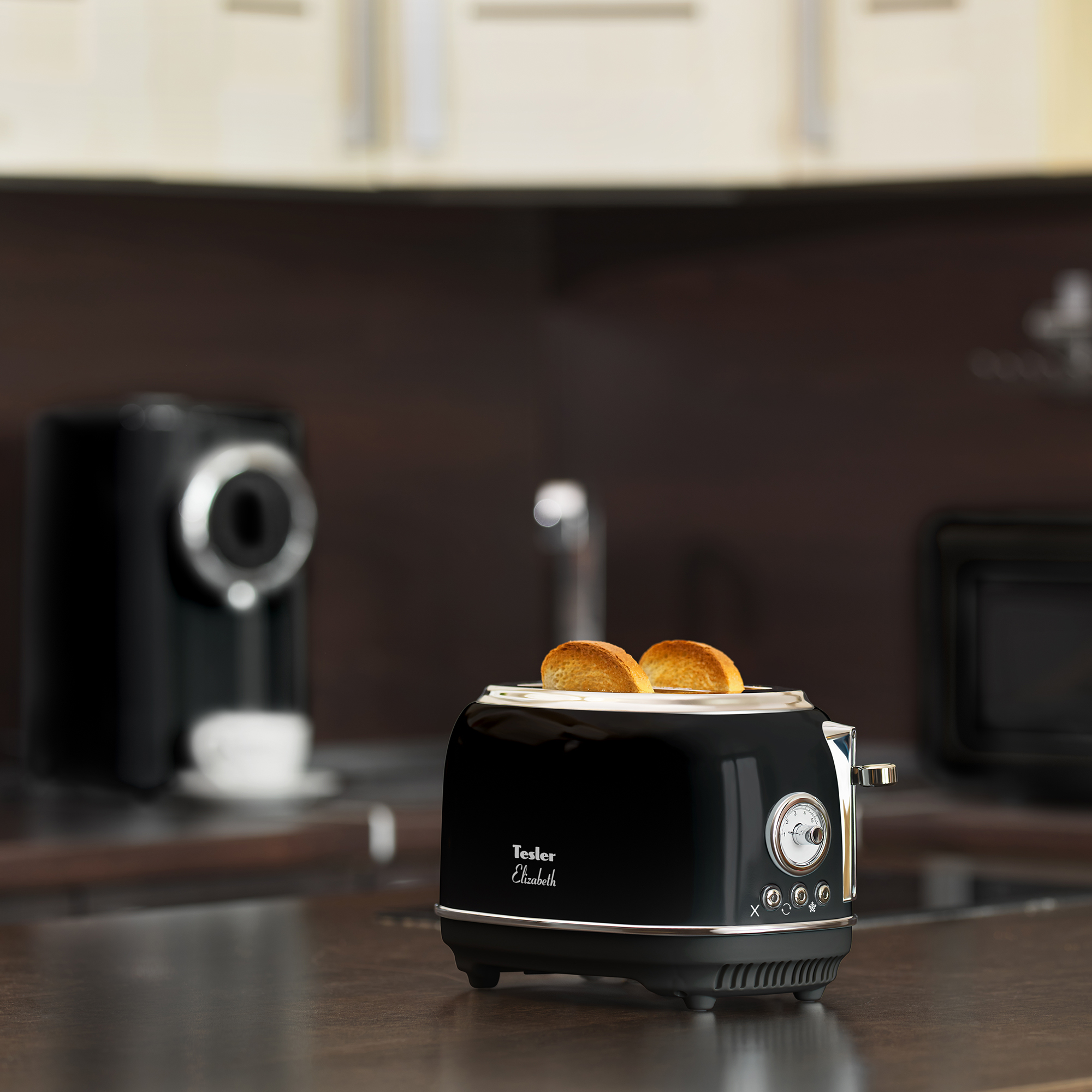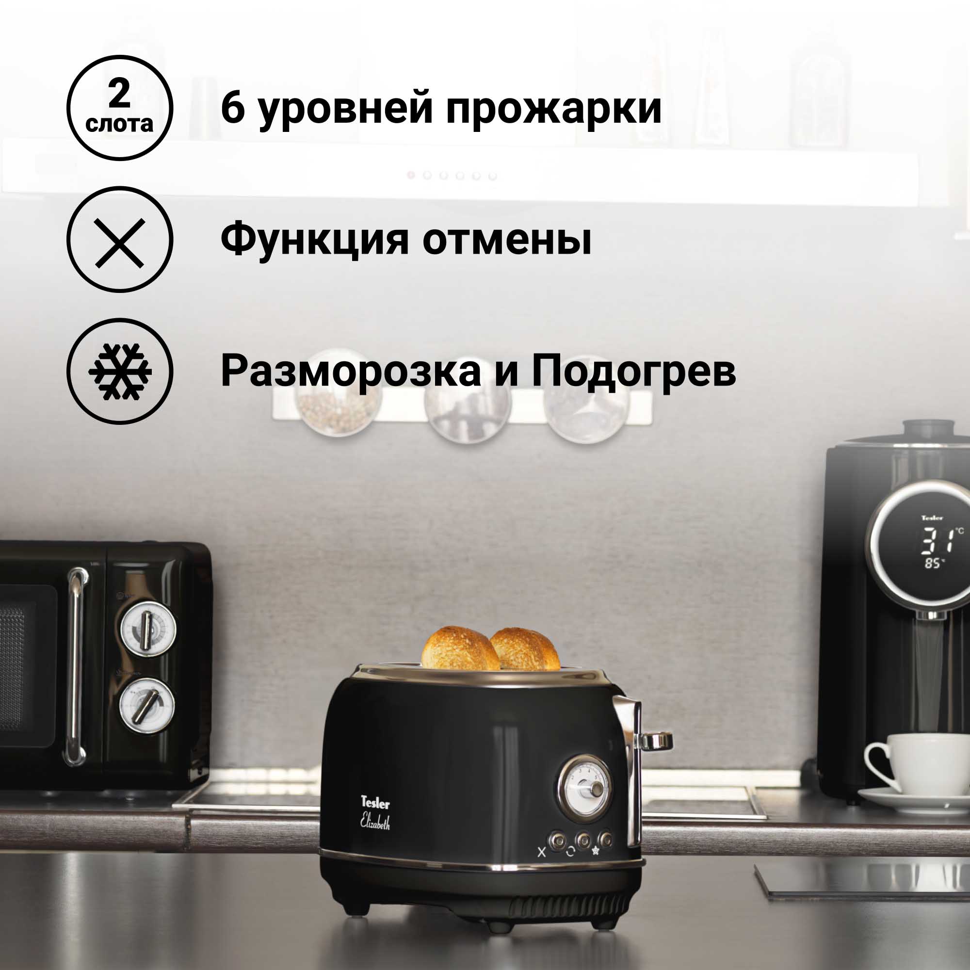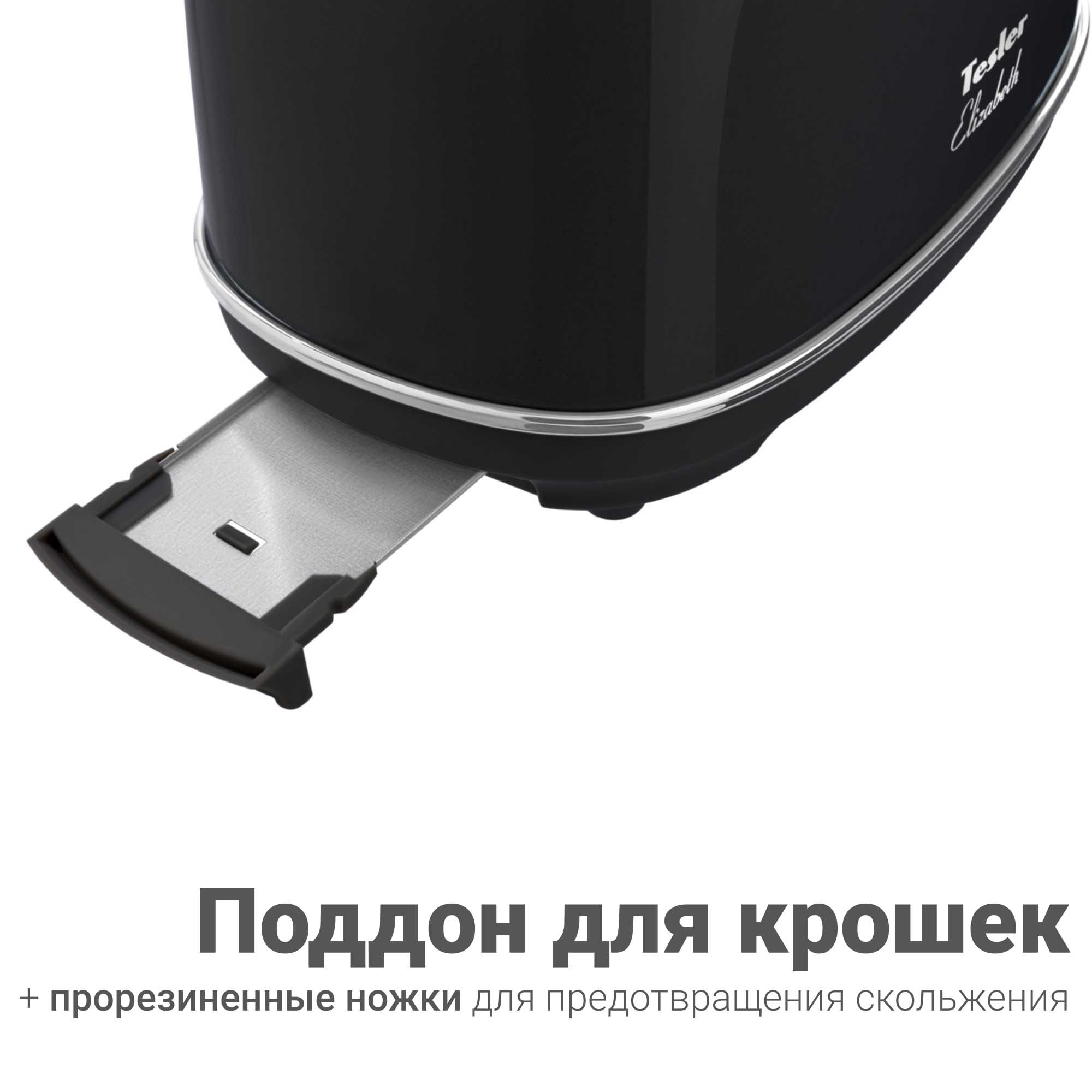 С чего начинают свой день большинство людей на земле? Конечно же со вкусных тостов на завтрак! Tesler Elizabeth TT-245 из линейки кухонных приборов Elizabeth поможет приготовить идеальные тосты. Тостер TT-245 быстро разогреет, поджарит или разморозит ломтики хлеба. От вас требуется только выбрать одну из 6 доступных степеней прожарки и опустить рычаг - всё остальное Elizabeth TT-245 сделает сам.