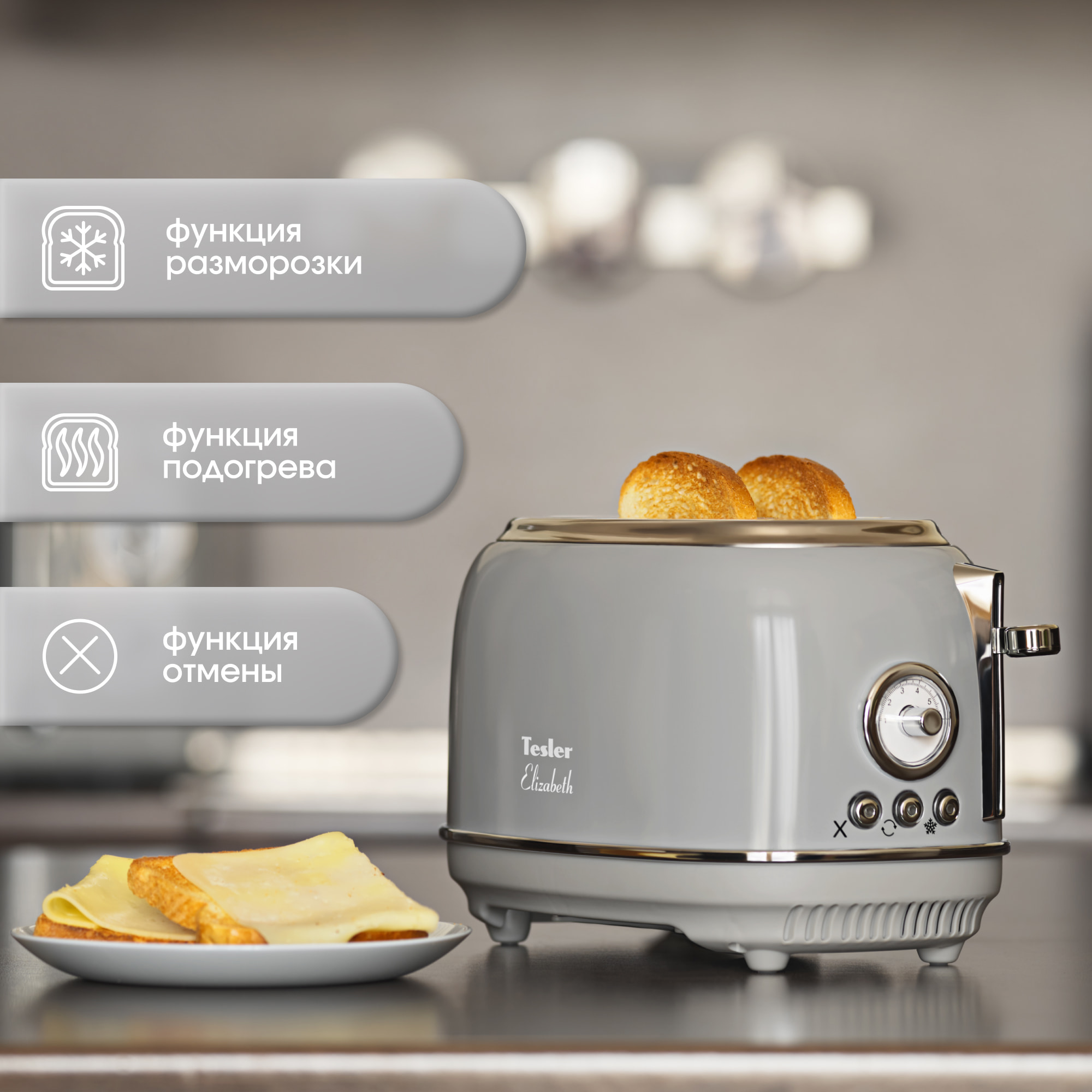 С чего начинают свой день большинство людей на земле? Конечно же со вкусных тостов на завтрак! Tesler Elizabeth TT-245 из линейки кухонных приборов Elizabeth поможет приготовить идеальные тосты. Тостер TT-245 быстро разогреет, поджарит или разморозит ломтики хлеба. От вас требуется только выбрать одну из 6 доступных степеней прожарки и опустить рычаг - всё остальное Elizabeth TT-245 сделает сам.