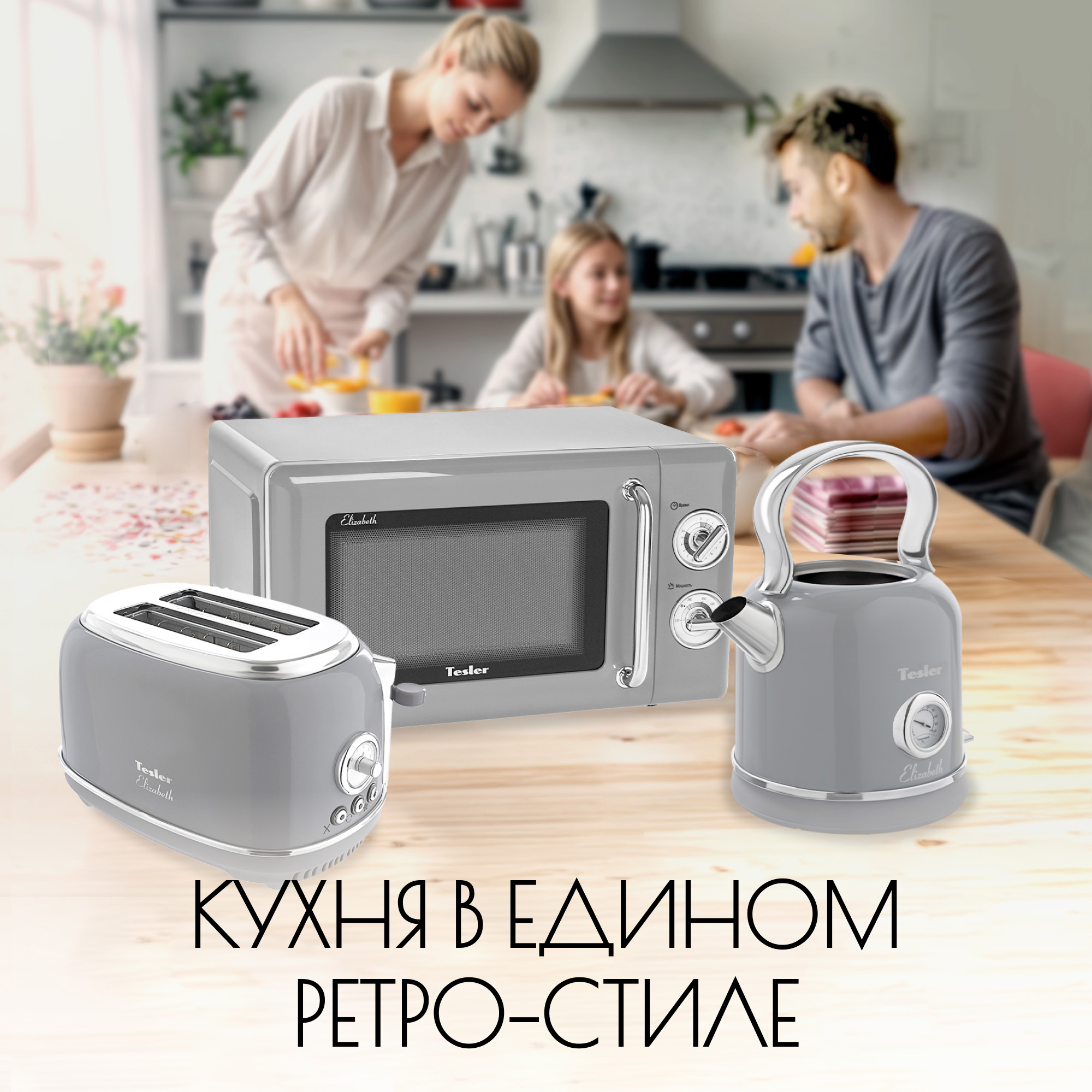 В комплект кухонной техники Tesler Elizabeth входят 3 устройства: СВЧ-печь, чайник и тостер.