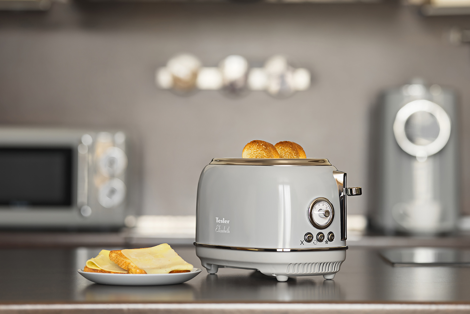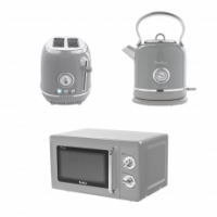 В комплект кухонной техники Tesler Elizabeth входят 3 устройства: СВЧ-печь, чайник и тостер.