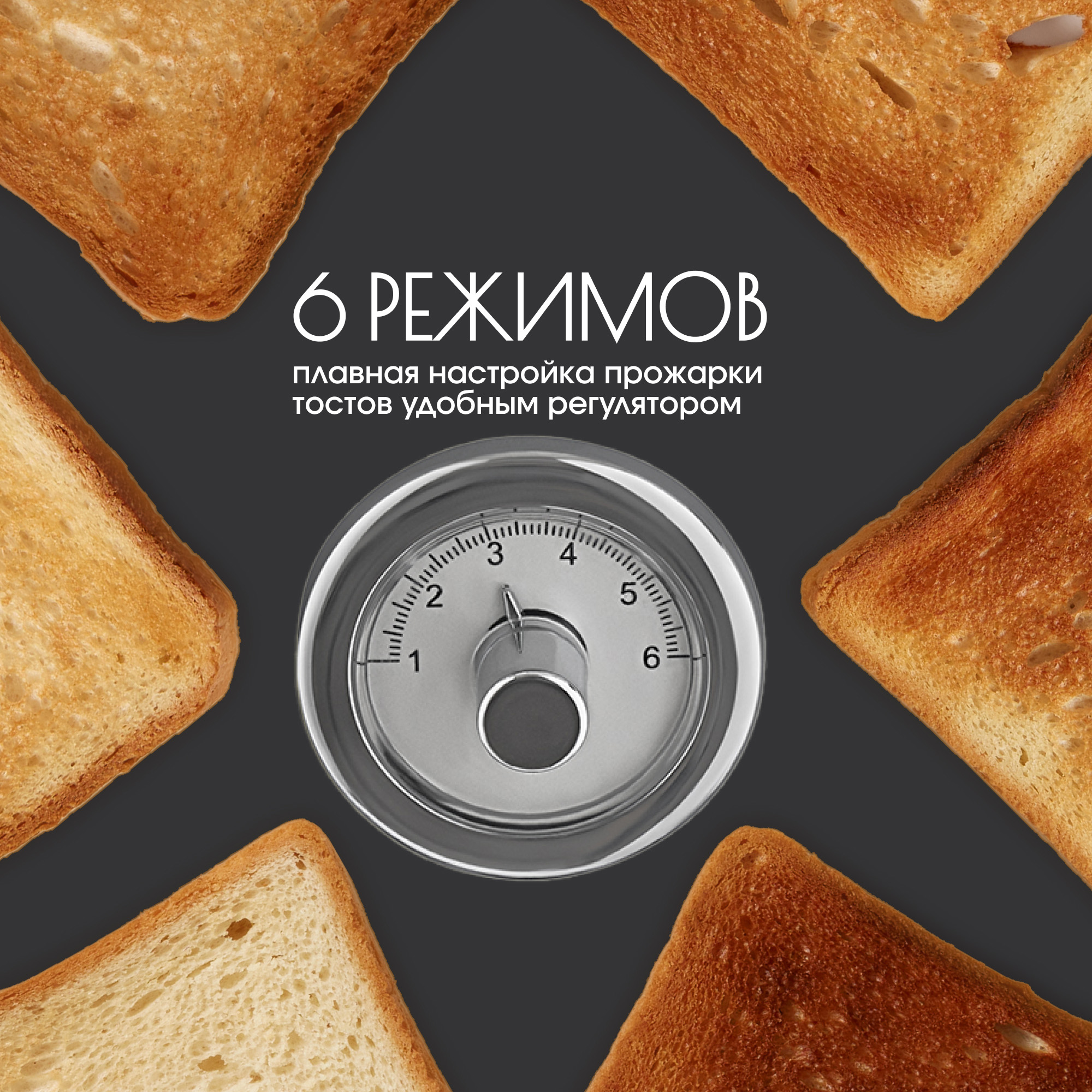 • 6 режимов прожарки и режим разморозки хлеба из холодильника.