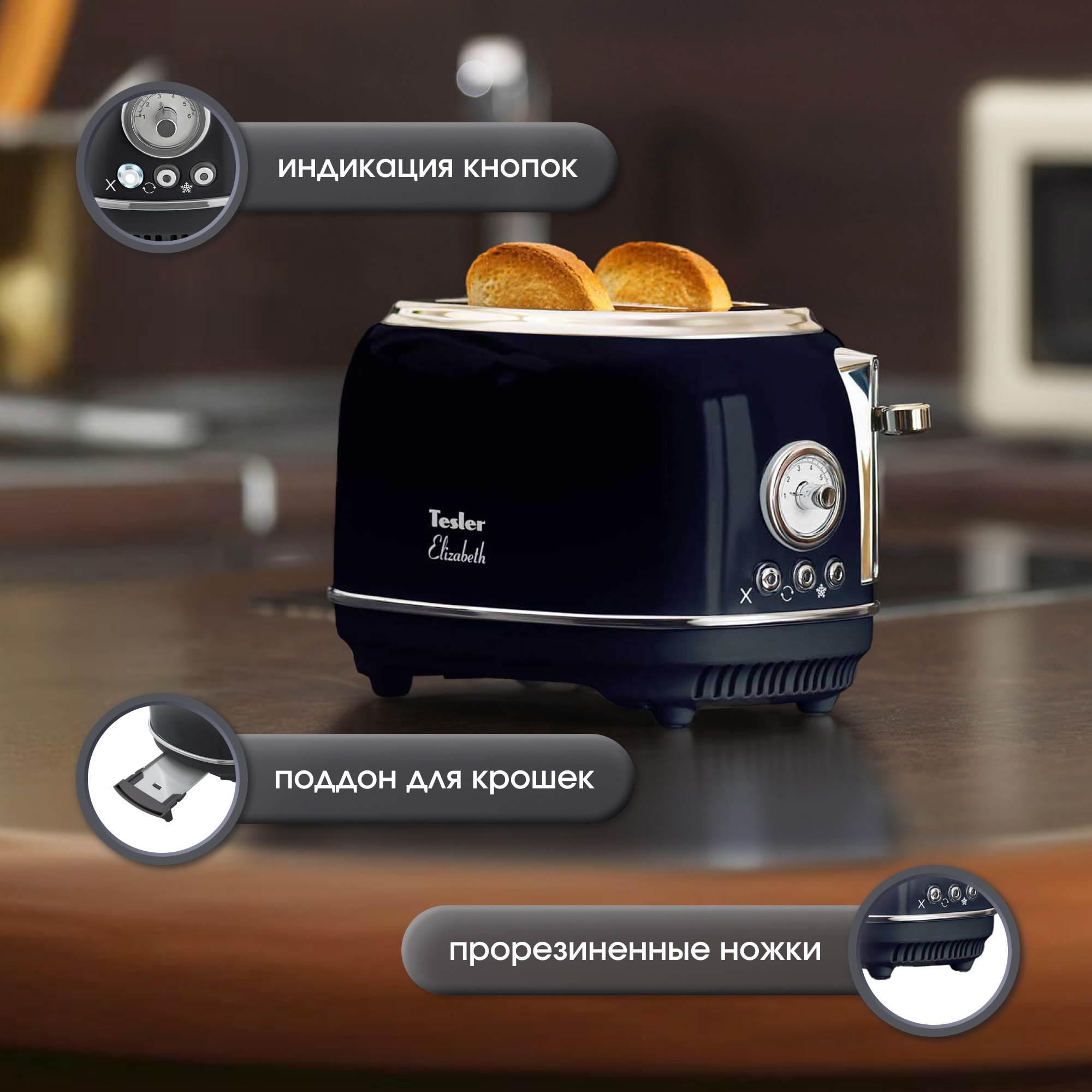 В комплект кухонной техники Tesler Elizabeth оттенка Midnight также входят чайник и тостер на 4 слота.