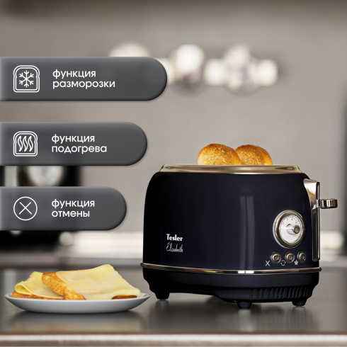 Тостер Tesler Elizabeth TT-245 из линейки кухонных приборов Elizabeth поможет приготовить идеальные тосты. Он быстро разогреет, поджарит или разморозит ломтики хлеба. От вас требуется только выбрать одну из 6 доступных степеней прожарки и опустить рычаг - всё остальное Elizabeth TT-245 сделает сам.