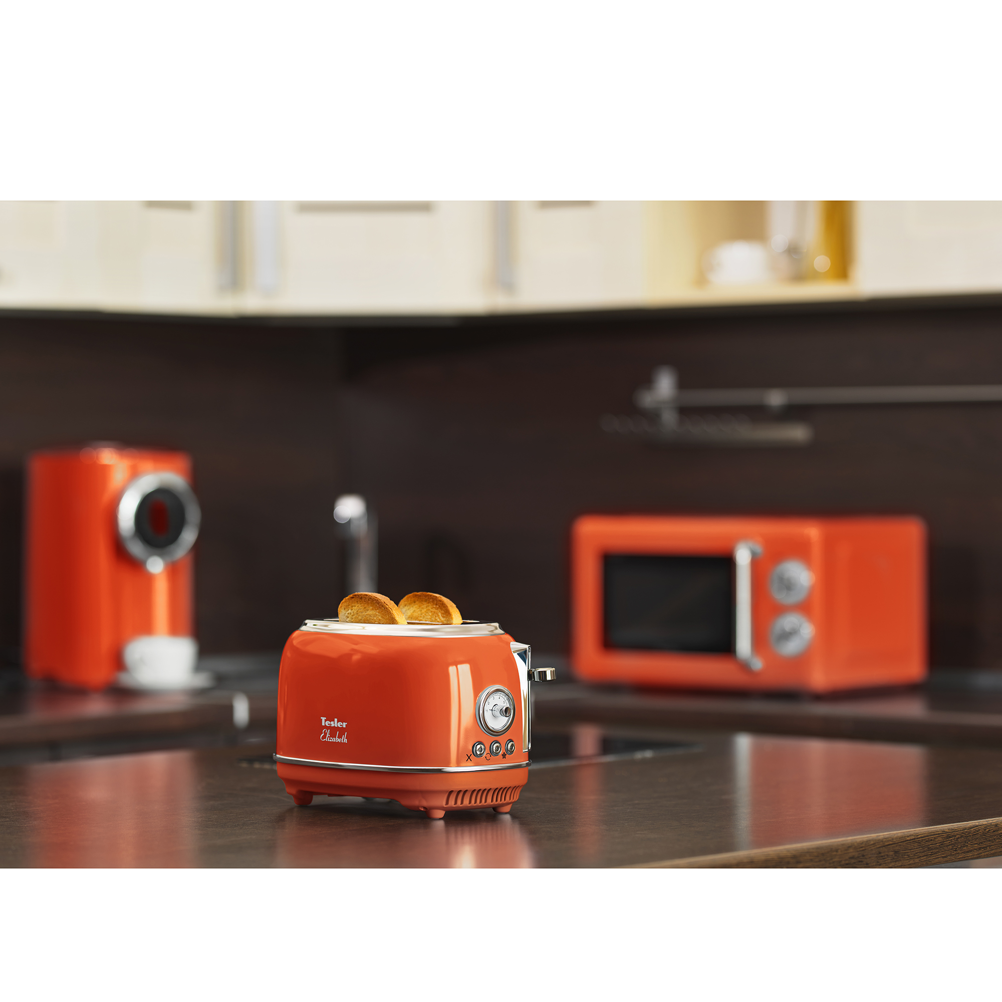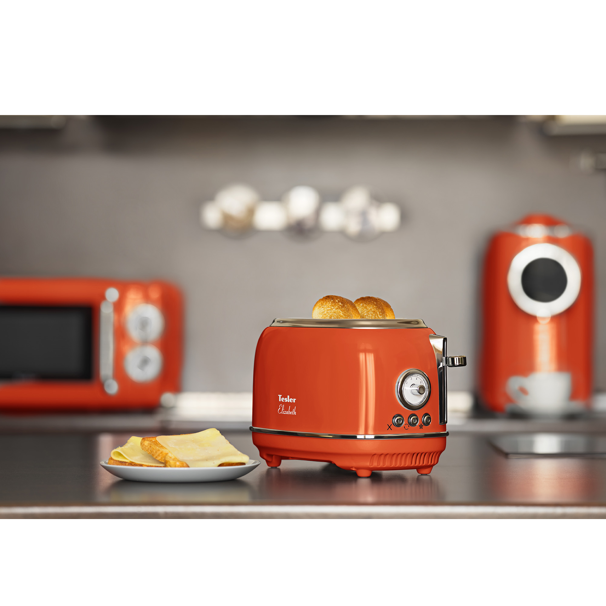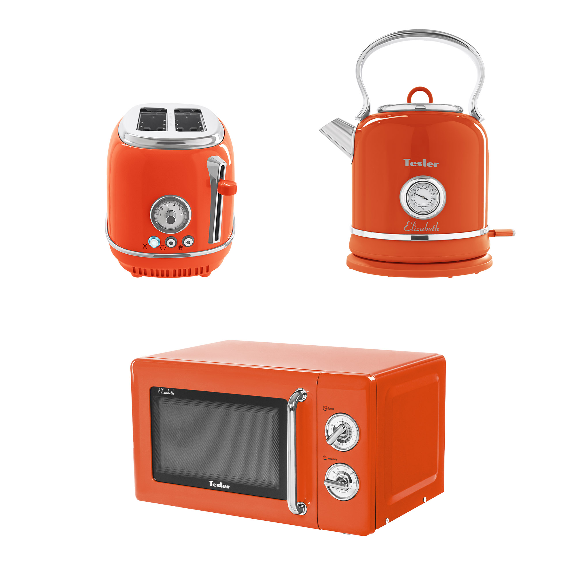 • В комплект кухонной техники Tesler Elizabeth входят 3 устройства: СВЧ-печь, чайник и тостер.