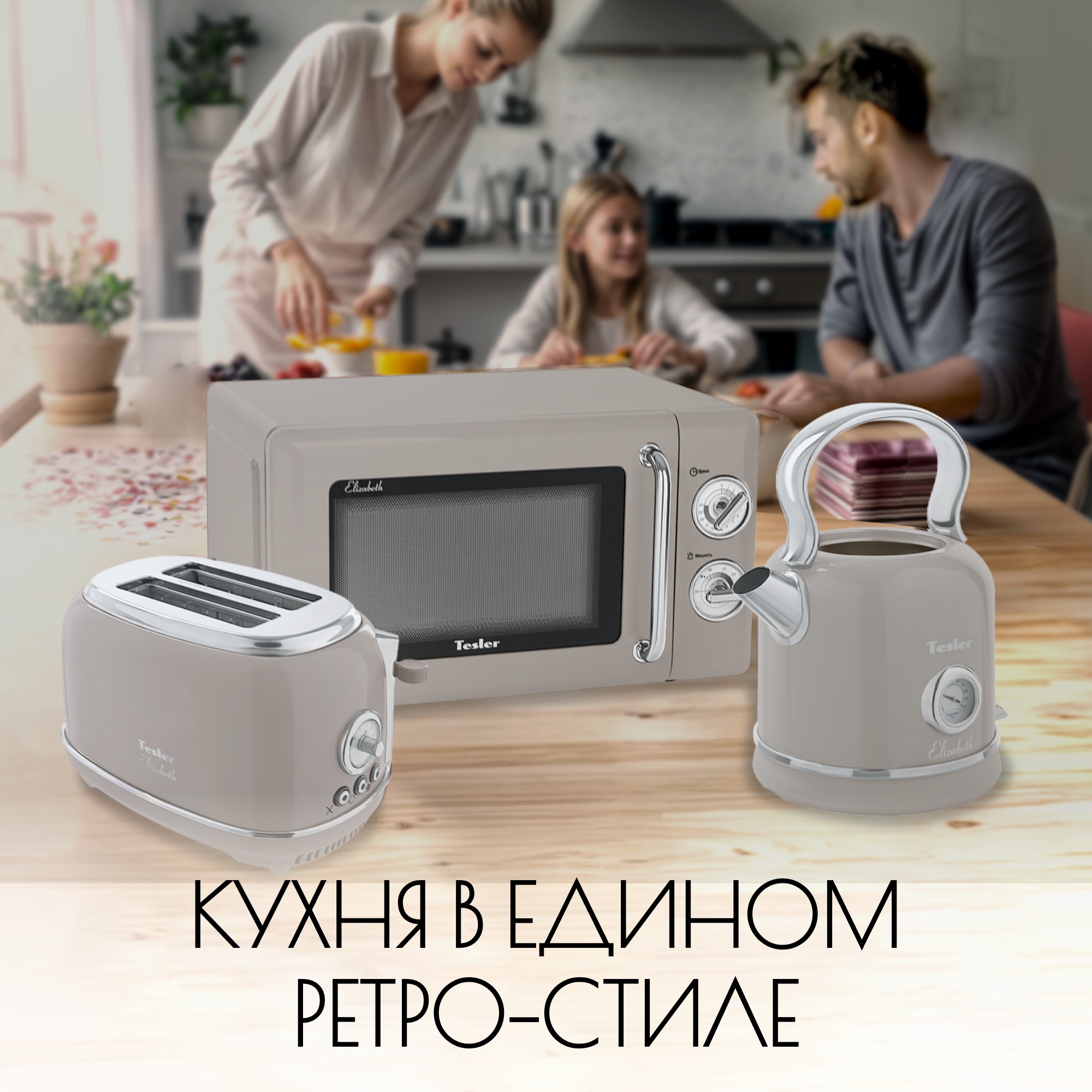 В комплект кухонной техники Tesler Elizabeth входят микроволновая печь, чайник, тостер и кофемашина.