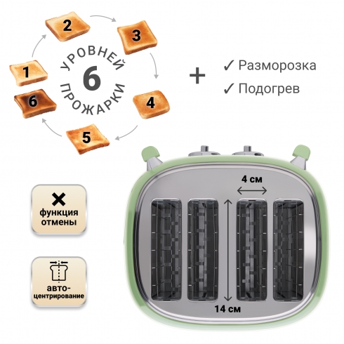 В случае перегрева тостер автоматически отключится, что защитит его от преждевременной поломки.